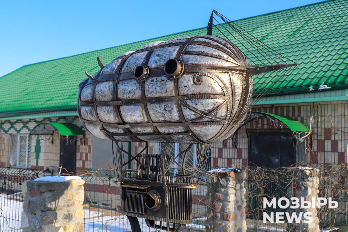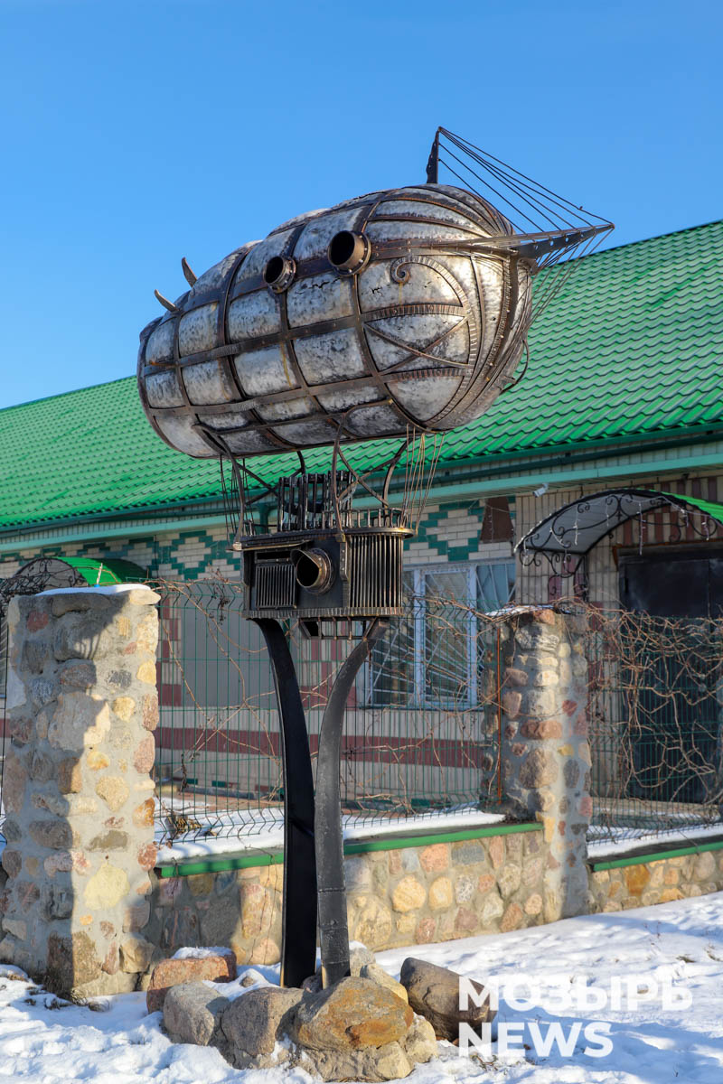 Установлен он на входе в недавно открывшуюся агроусадьбу «Счастье есть!». Ее хозяин Виктор Бардашевич оформил в стиле стимпанк не только интерьер, но и прилегающую территорию. Очень креативное архитектурное решение, ничего подобного мы до сих пор нигде не встречали.