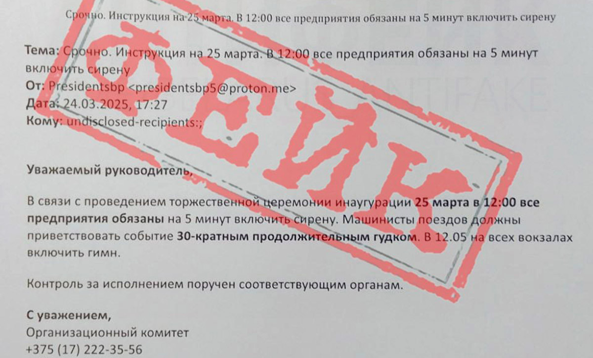 В письме с пометкой «Срочно!» содержится ложная информация – в ней говорится, что в связи с торжественной церемонией инаугурации Главы государства необходимо в 12:00 на 5 минут включить сирену. Также машинисты поездов «должны приветствовать событие» 30-кратным продолжительным гудком, а на всех вокзалах предписано включить гимн.