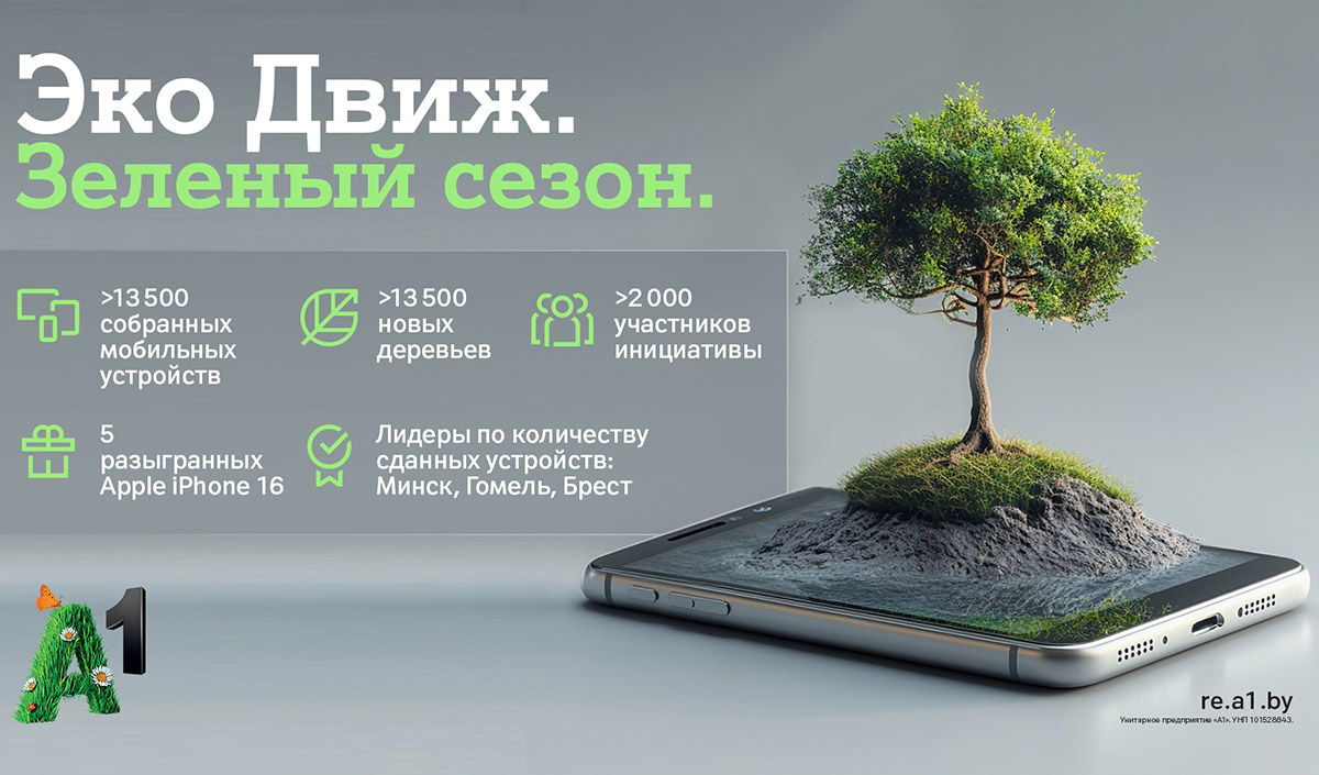 В рамках инициативы «Эко Движ. Зеленый сезон» белорусы с 10 марта по 13 апреля могли сдать свои старые мобильные телефоны, планшеты, смарт-часы, электронные книги и фитнес-браслеты в магазины А1. В обмен на каждое устройство они получали игровые коды для участия в розыгрыше призов – пяти смартфонов iPhone 16.