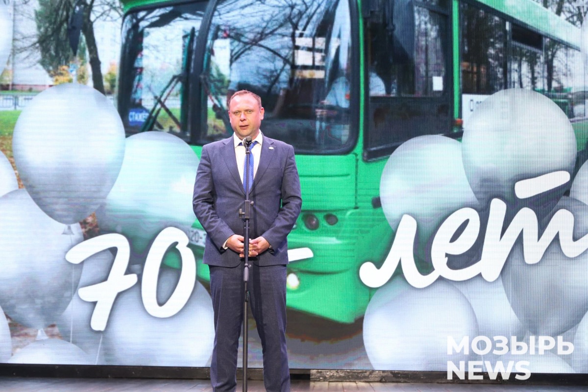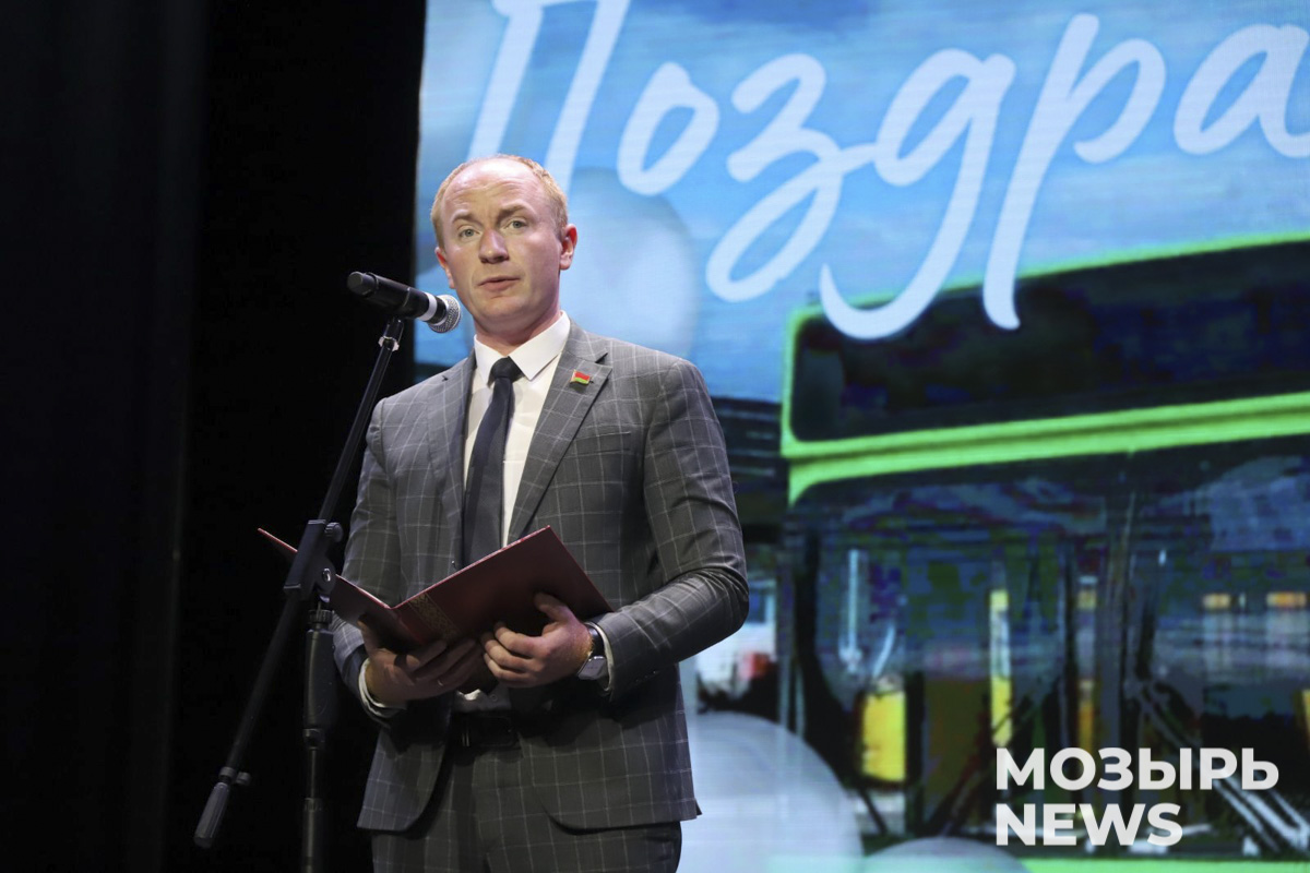 Менялись годы, эпохи, поколения, но работа общественного транспорта Мозырщины не останавливалась ни на секунду. Коллектив Автобусного парка № 2 со сцены поздравил его директор Александр Морозов. Он поблагодарил команду за добросовестный труд, стрессоустойчивость в критических ситуациях и профессионализм.