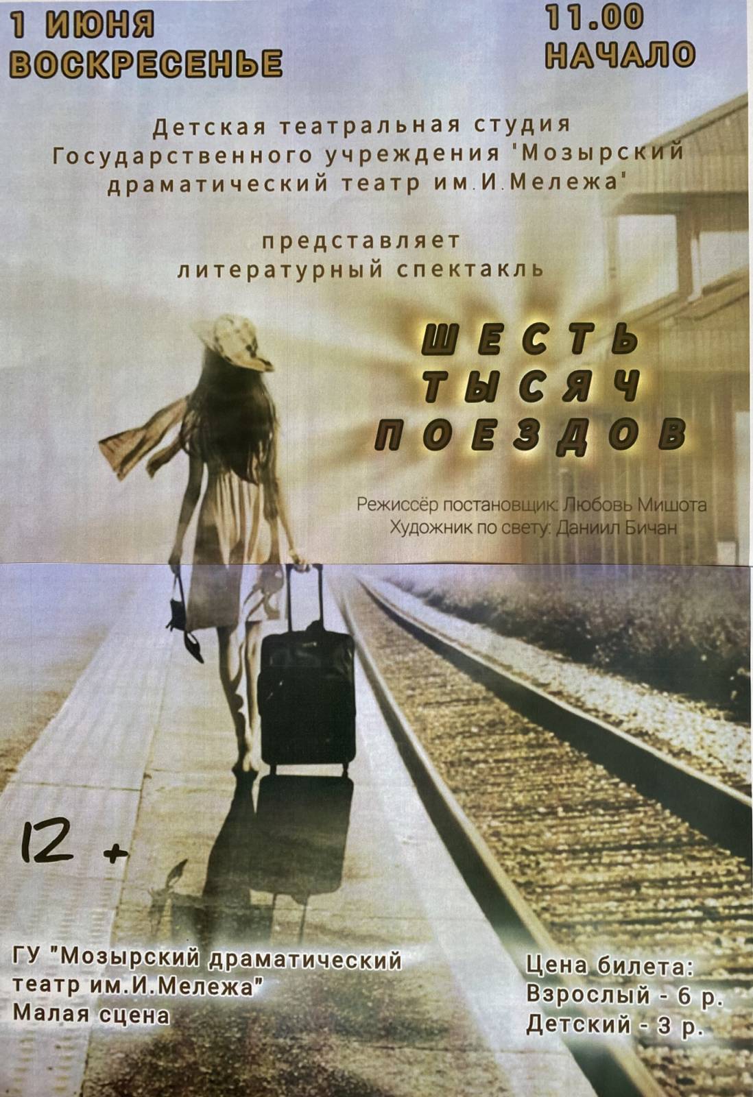 Литературный спектакль «Шесть тысяч поездов» адресован ребятам постарше, возрастной категории 12+. В основу литературно-театральной композиции легло стихотворение Самуила Маршака «Шесть тысяч поездов». «Шесть тысяч длинных поездов // Бегут по рельсам каждый день, // От городов до городов, // Минуя сотни деревень… Вся наша жизнь – большое путешествие и проверка на зрелость, ум, храбрость, доброту, любовь и достоинство».