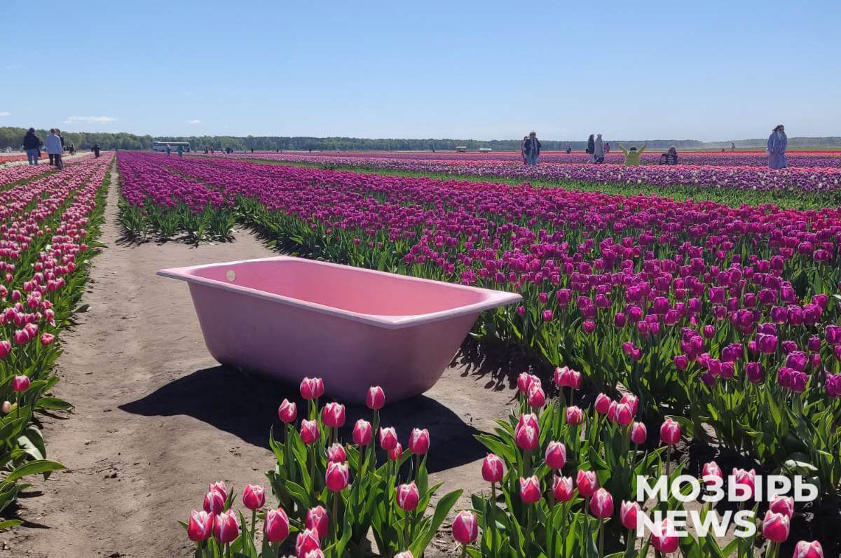 Здесь много людей и машин. Гости со всех уголков нашей страны и ближнего зарубежья приезжают зарядиться позитивом и хорошим настроением, отдохнуть в цветочном раю. Это место для посещения выбирают и просто любители красивого отдыха, и профессиональные фотографы. Повсюду – люди с объективами камер и позирующие им модели. Одни снимаются в обычной одежде, другие специально (как мы) привозят наряды с собой. На территории поля много фотозон в виде декоративных кованых столиков со стульями, качелей, розовой ванны, огромного зеркала, велосипедов и букетов тюльпанов.