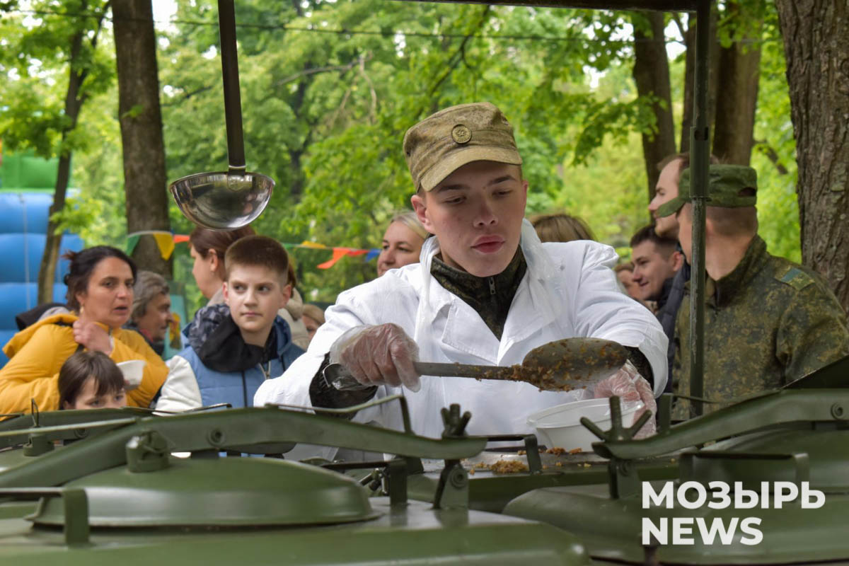 И действительно! Разве можно было допустить, чтобы День Победы оказался без солдатской каши? Никак нет! Об этом подумали организаторы праздничного мероприятия и разместили в парке полевую кухню с раздачей солдатской каши, толк в приготовлении которой знают военнослужащие войсковых частей, расположенных в Мозырском гарнизоне.