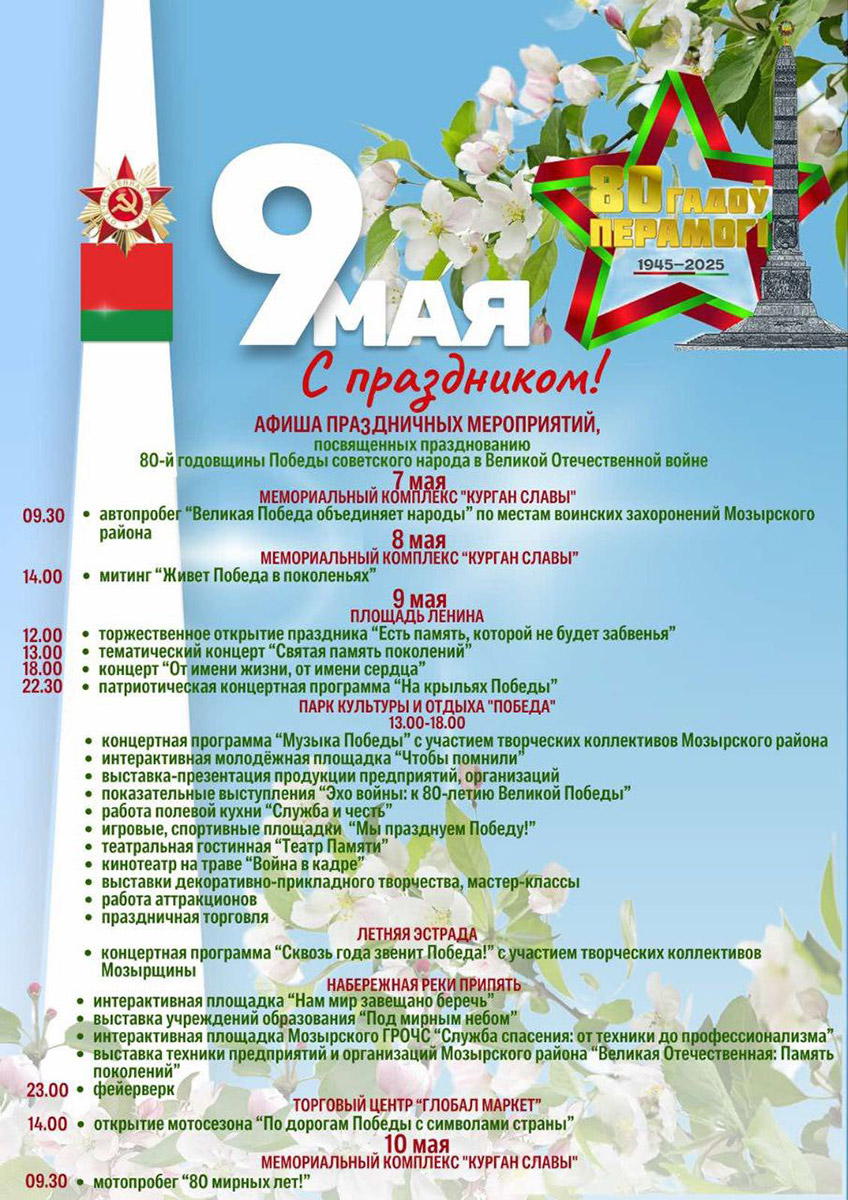 9 мая Мозыр отмечает юбилей Великой Победы! Будут работать концертные, торговые и тематические площадки сразу в трёх локациях: площадь Ленина, набережная реки «Припять» и в городской парк «Победа». Завершится праздничная программа ярким фейерверком!