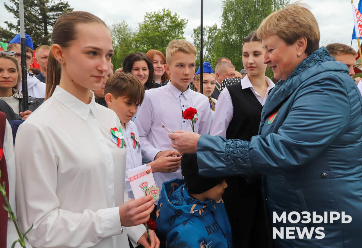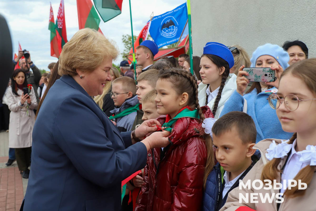 Повязали пионерские галстуки ребятам председатель Мозырского райисполкома Елена Павлечко, депутат Палаты представителей Национального собрания Республики Беларусь Оксана Ковалькова, первый секретарь Мозырского районного комитета ОО БРСМ Вероника Палова.