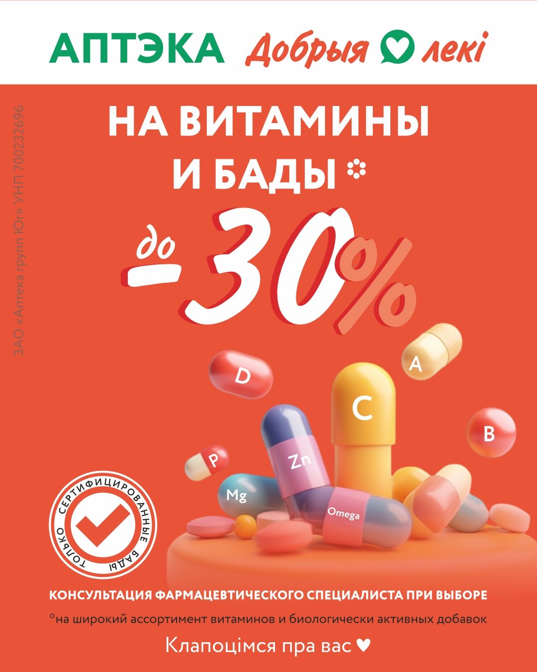 Со 2 по 30 июня в аптеках “Добрыя лекі” можно будет приобрести широкий ассортимент витаминов и биологически активных добавок, сэкономив до 30%!