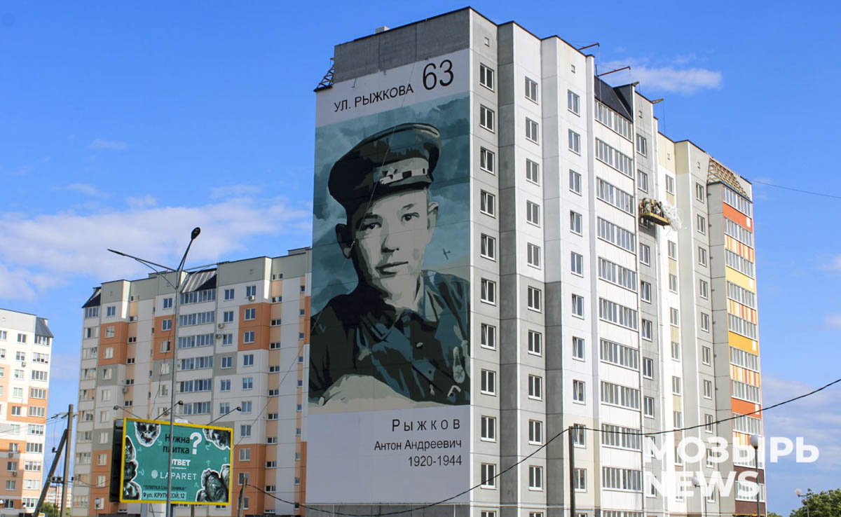 Накануне Дня Независимости портрет капитана Антона Рыжкова, отличившегося при форсировании Днепра, появился на стене недавно возведенного специалистами ОАО «Мозырский домостроительный комбинат» 11-этажного дома № 63.