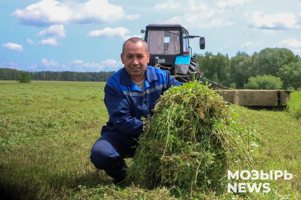 Механизатор Виктор Заяц в день репортажа косил самоходной косилкой люцерну в урочище «Соловьевка». Чтобы попасть туда, нужно проехать через заповедные места – заказник «Мозырские овраги». Красиво так, что глаз не оторвать. И пахнет по-особенному – такой аромат только вдали от города, хотя за деревьями на кромке поля были видны последние этажи домов улиц Интернациональной и Якуба Коласа.
