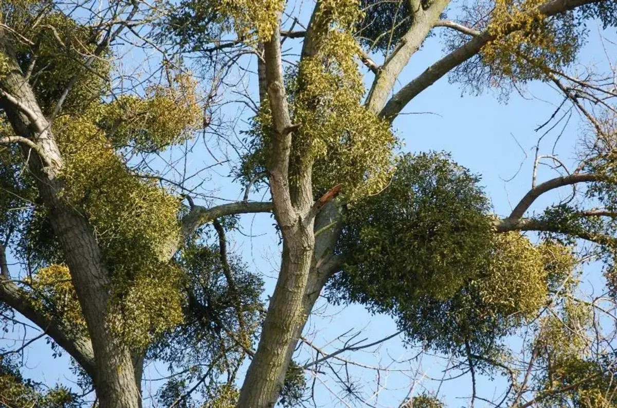 Выявить омелу просто: она похожа на зеленые шары или гнезда птиц в кронах деревьев, которые могут достигать в диаметре 2,5 метра. Растение-паразит образует кустики с мясистыми листьями и белыми ягодами. Цветет омела обычно зимой, а ядовитые для человека ягоды созревают к концу зимы–началу весны. Семена омелы распространяют птицы.