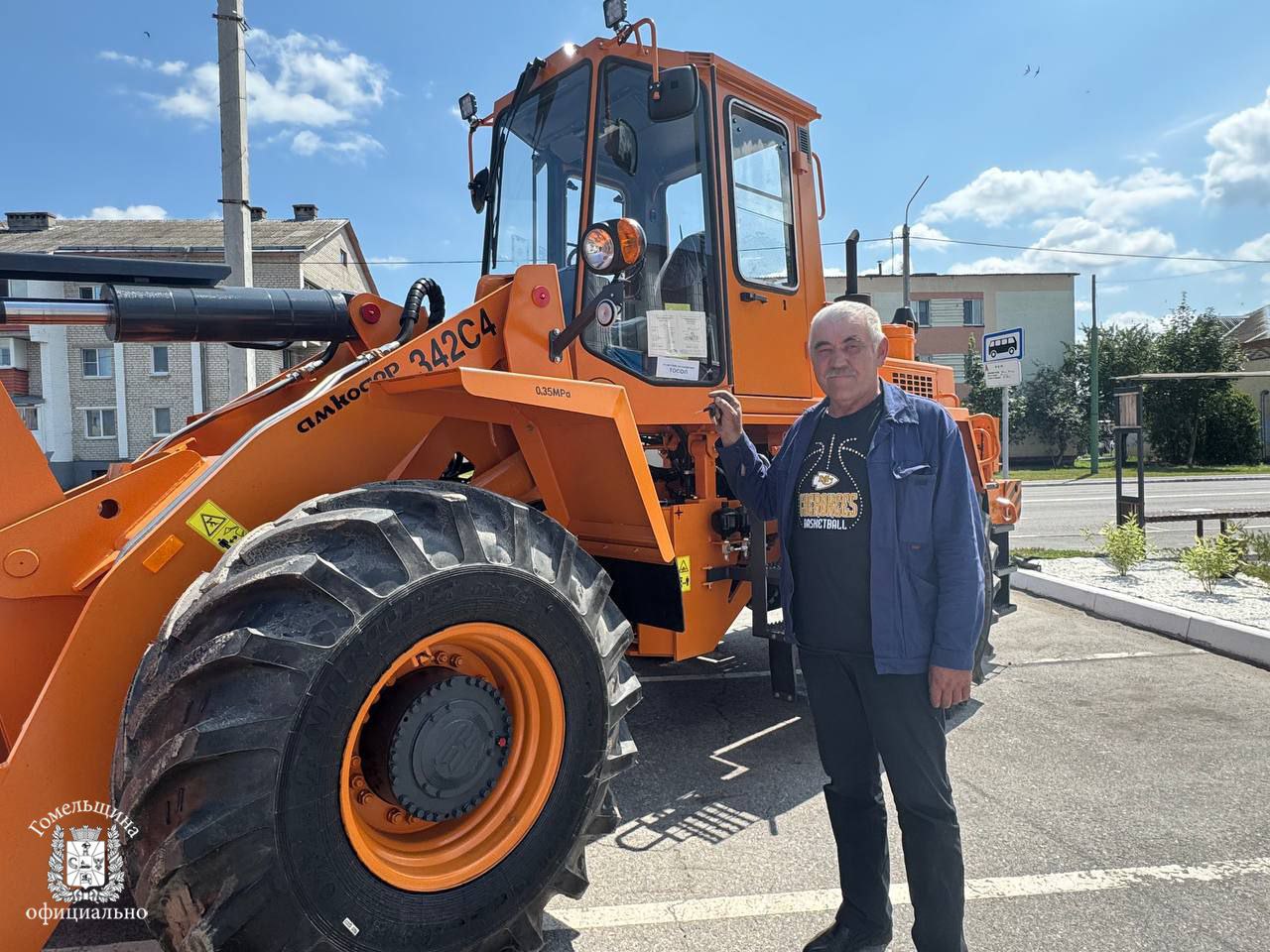 Вместе с руководителем Ельского района Виктором Замостиком Руслан Викторович вручил опытному работнику коммунального предприятия Владимиру Кондратенко, стаж которого превышает 20 лет, ключи от нового трактора «Амкодор».