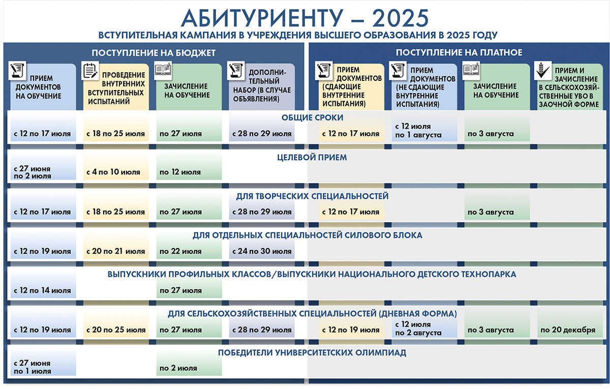 Так, для отдельных специальностей силового блока прием документов на бюджет пройдет с 12 по 19 июля, вступительные испытания там состоятся 20-21 июля, зачисление — по 22 июля.