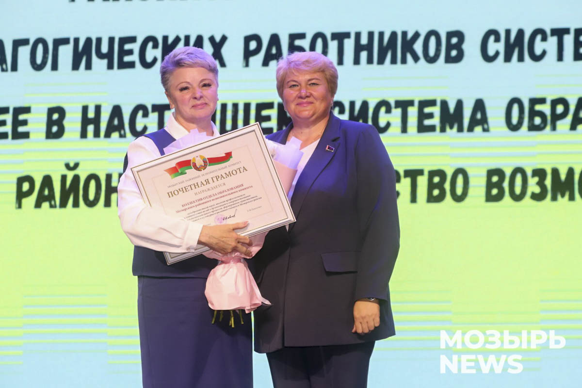 Первой поприветствовала собравшихся Елена Павлечко. Она отметила, что педагогическая профессия – одна из самых важных и востребованных в мире, поскольку от труда наставников во многом зависит будущее страны. Елена Федоровна тепло поздравила педагогическую общественность Мозырщины с завершением очередного этапа, рассказала об успехах и достижениях наставников и ребят и вручила букет цветов от районного исполнительного комитета главному педагогу района, пожелав всем работникам сферы образования личных и профессиональных побед.
