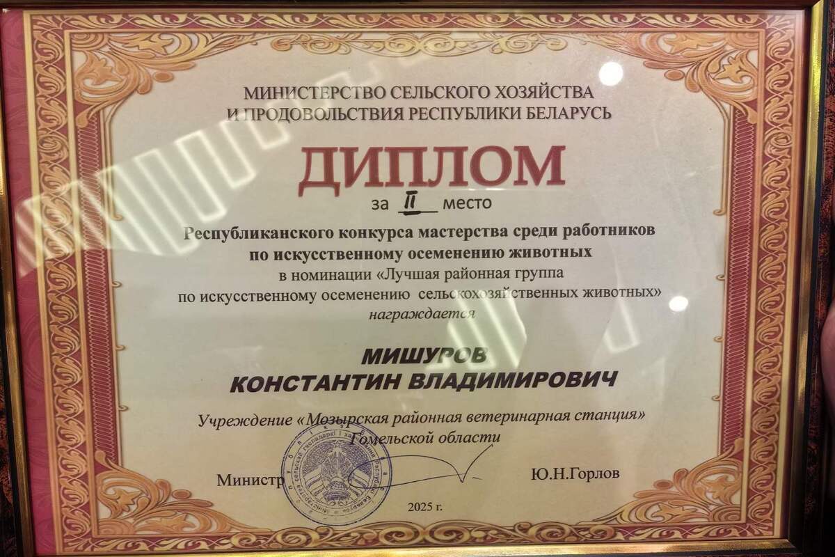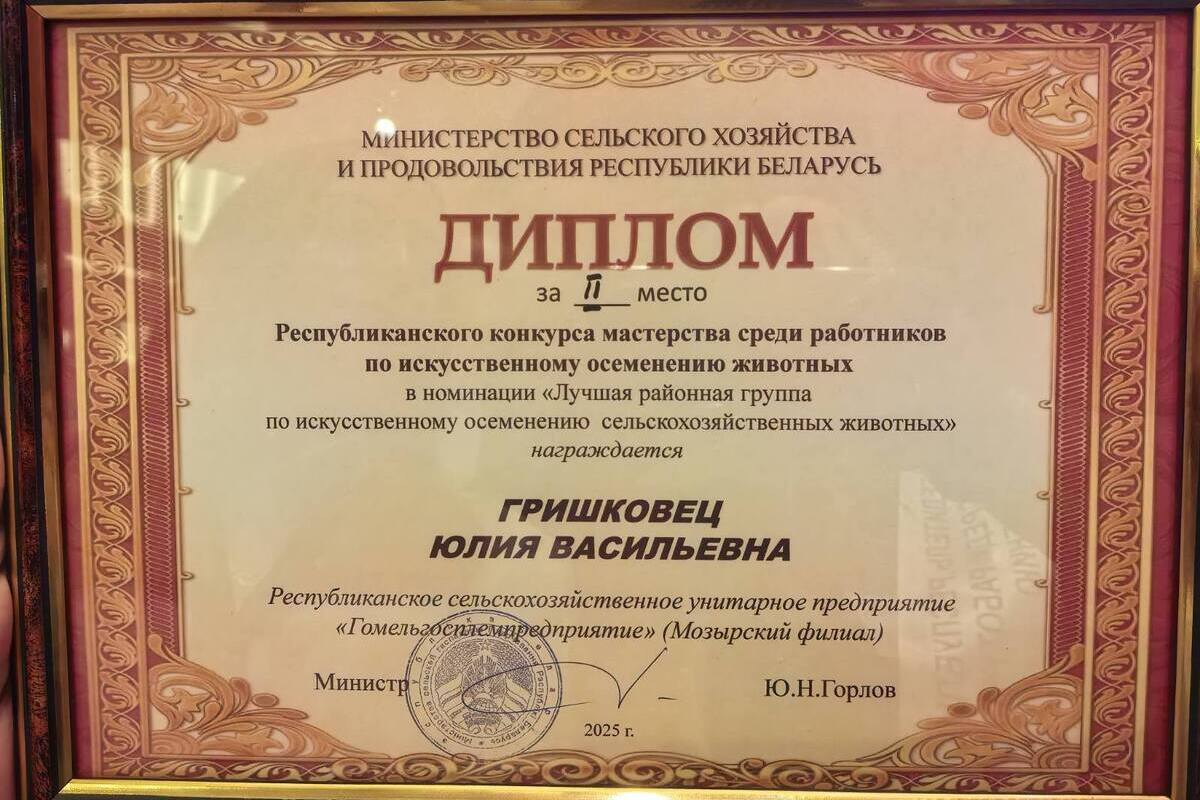 Дипломом II степени были награждены мозырские специалисты – районная группа по искусственному осеменению сельскохозяйственных животных в составе зоотехника-селекционера мозырского филиала РСУП «Гомельгосплемпредприятие» Юлии Гришковец и ветеринарного врача Мозырской районной ветеринарной станции Константина Мишурова.