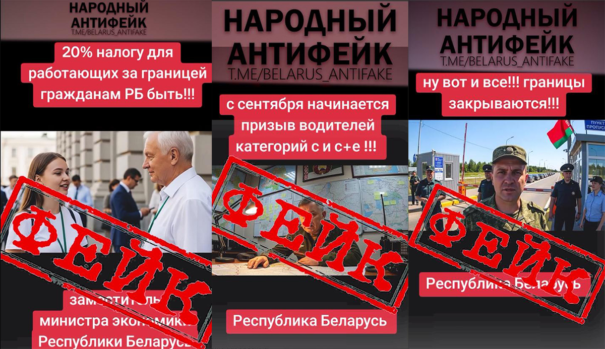 На первом ролике с дезинформацией «заместитель министра экономики» якобы говорит о принятом решении обложить работающих за границей белорусов 20-процентным налогом. На втором – «полковник» с суровым лицом сообщает, что с сентября начинается призыв водителей большегрузов для переобучения на категорию Т. «Военный» подчеркивает, что «это касается тех, кто работает за границей». А на третьем ролике «пограничник» на фоне КПП предупреждает, что с 15 сентября «в связи с событиями на границах Республики Беларусь выезд наземным транспортом только по спецразрешениям».