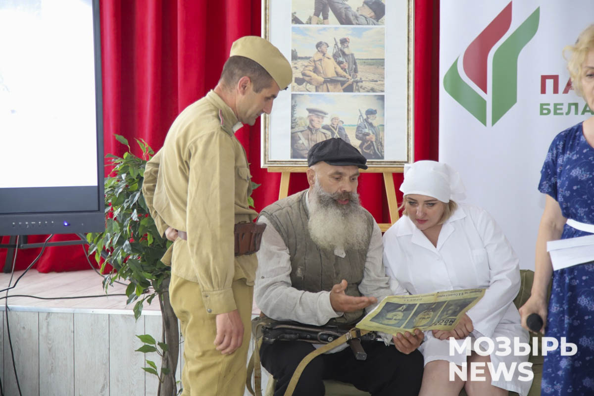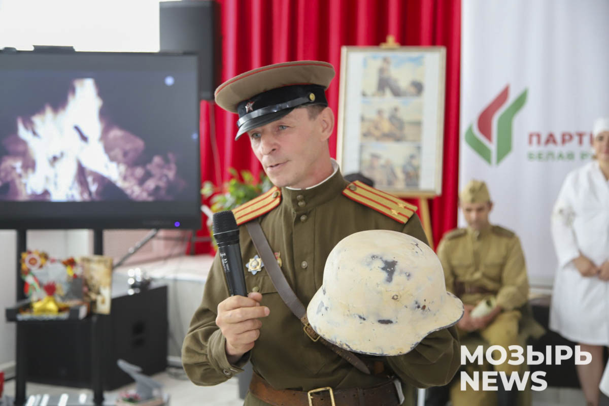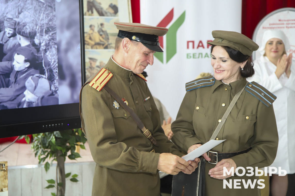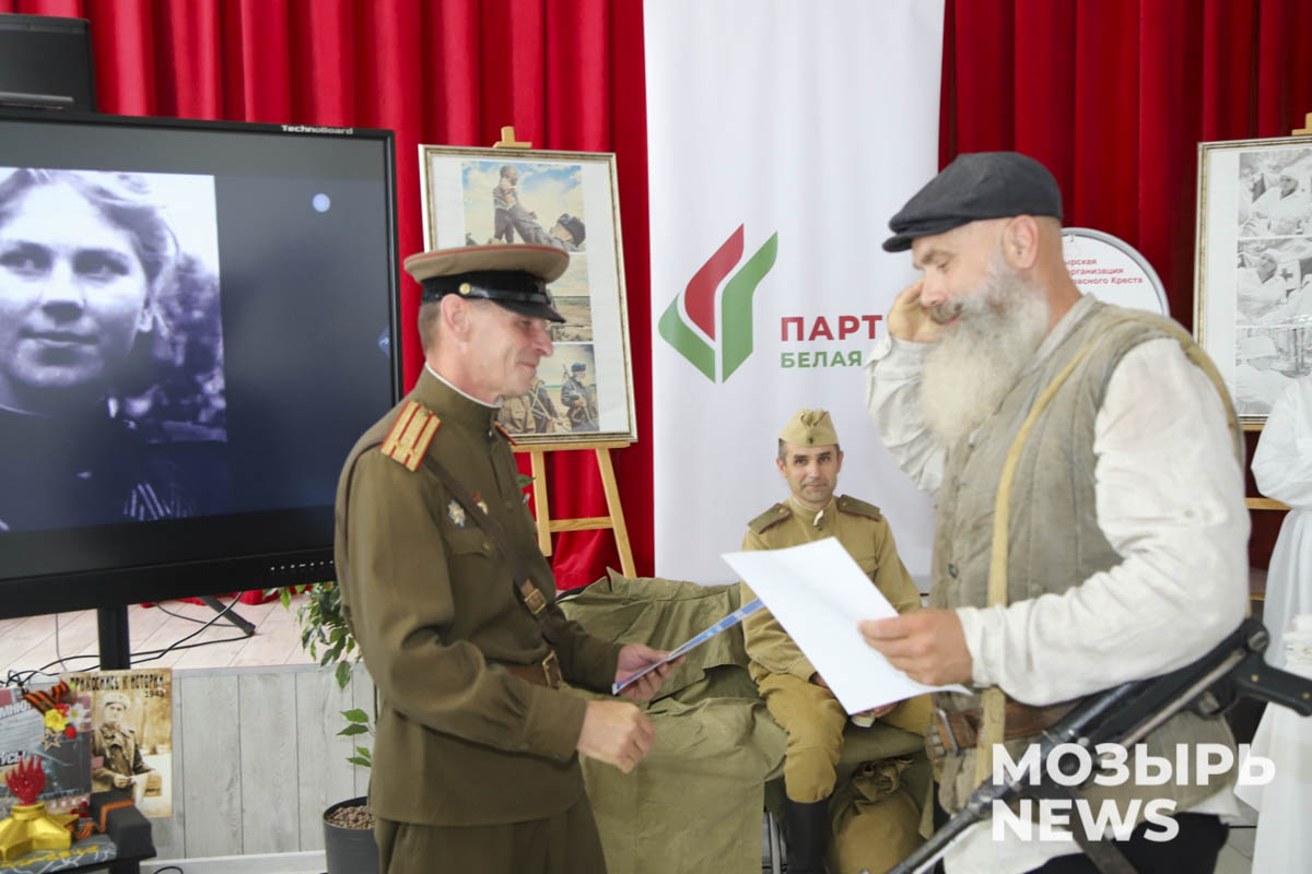 Среди почетных гостей, которые были приглашены на торжественное открытие выставки, – председатель Мозырской районной организации Белорусского общества Красного Креста Тамара Головацкая, историк-краевед, председатель комиссии по сохранению исторического наследия Мозырского Совета ветеранов, автор книг об истории Мозырщины Татьяна Никитина, главный специалист отдела образования Мозырского райисполкома, секретарь районного отделения партии «Белая Русь» Татьяна Дуброва, действующий сотрудник Хойникского отдела Департамента охраны МВД, реконструктор, руководитель поискового отряда «Честь ветерану», в составе Гомельского областного клуба «Юнона» Александр Медведков, мастер по камню, который на безвозмездной основе выполняет работы по изготовлению и ремонту памятников на воинских захоронениях, Сергей Романюк, специалист по социальной работе Людмила Кузьменко, школьники, студенты, волонтеры. На встрече было много теплых, проникновенных и душевных выступлений. Говорили об исторической памяти, о войне и о том, что она никогда больше не должна повториться. Увидели зрители и фрагменты военно-исторических реконструкций. Кстати, все участники проекта после окончания выступления получили благодарности.
