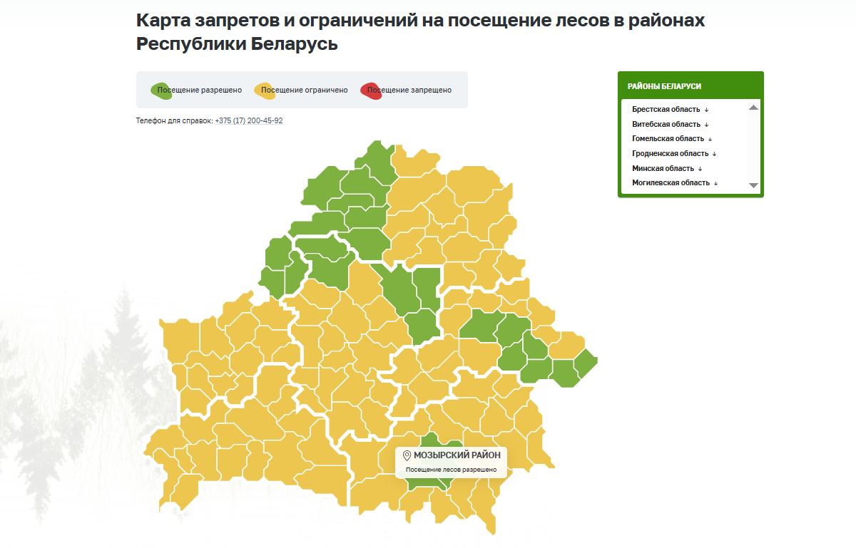 В юго-восточном регионе ограничения на посещение лесного фонда действуют во всех районах, кроме Мозырского, Калинковичского, Рогачевского и Жлобинского. То есть на территориях, отмеченных на карте оранжевым, нельзя в лес на машине, а также разжигать там костры и мангалы.