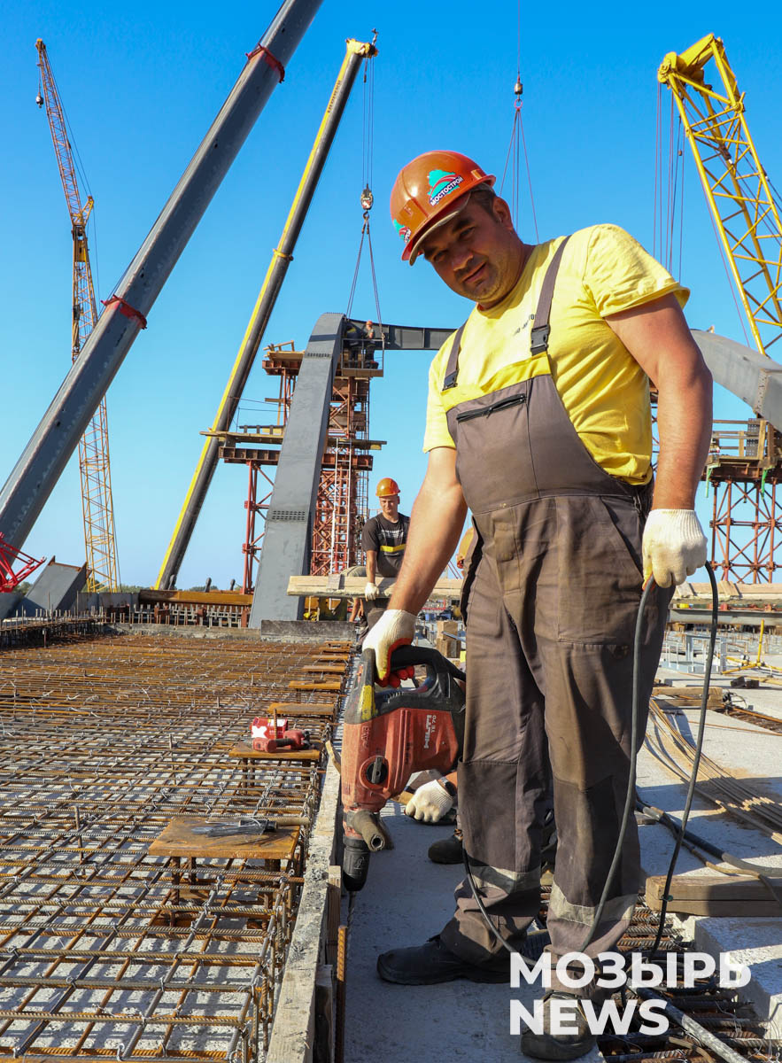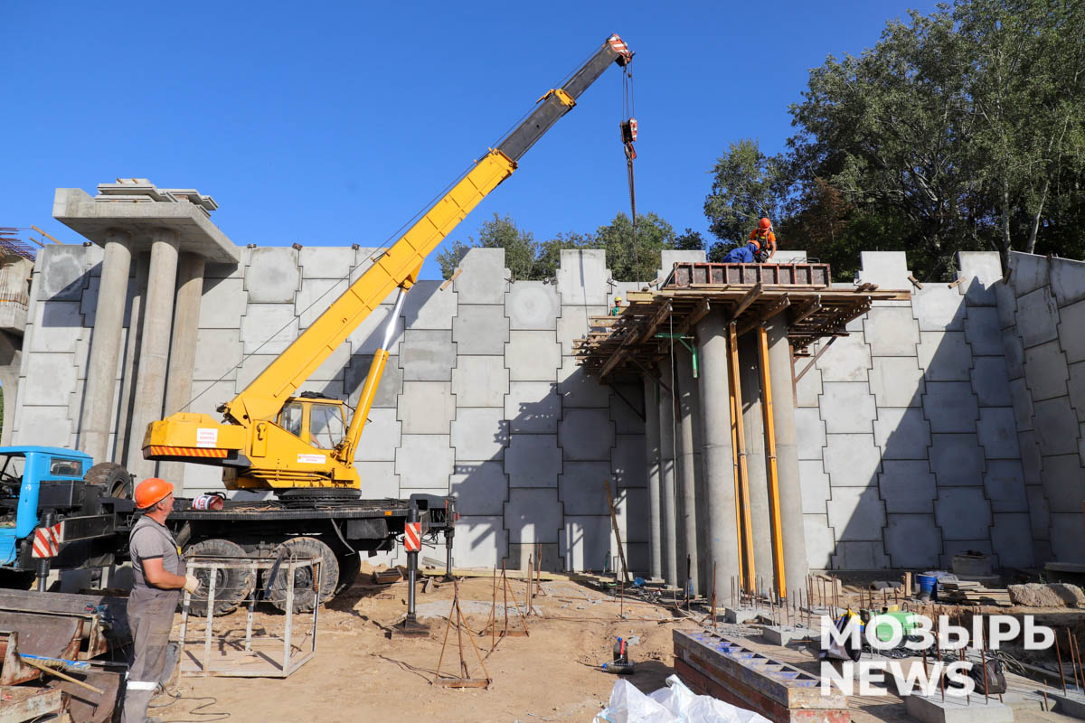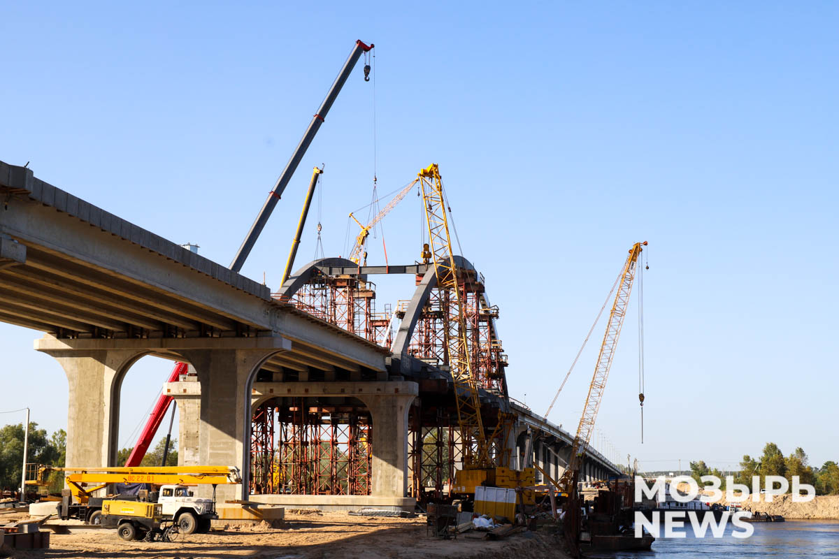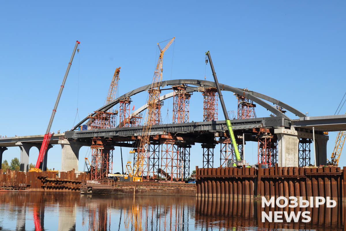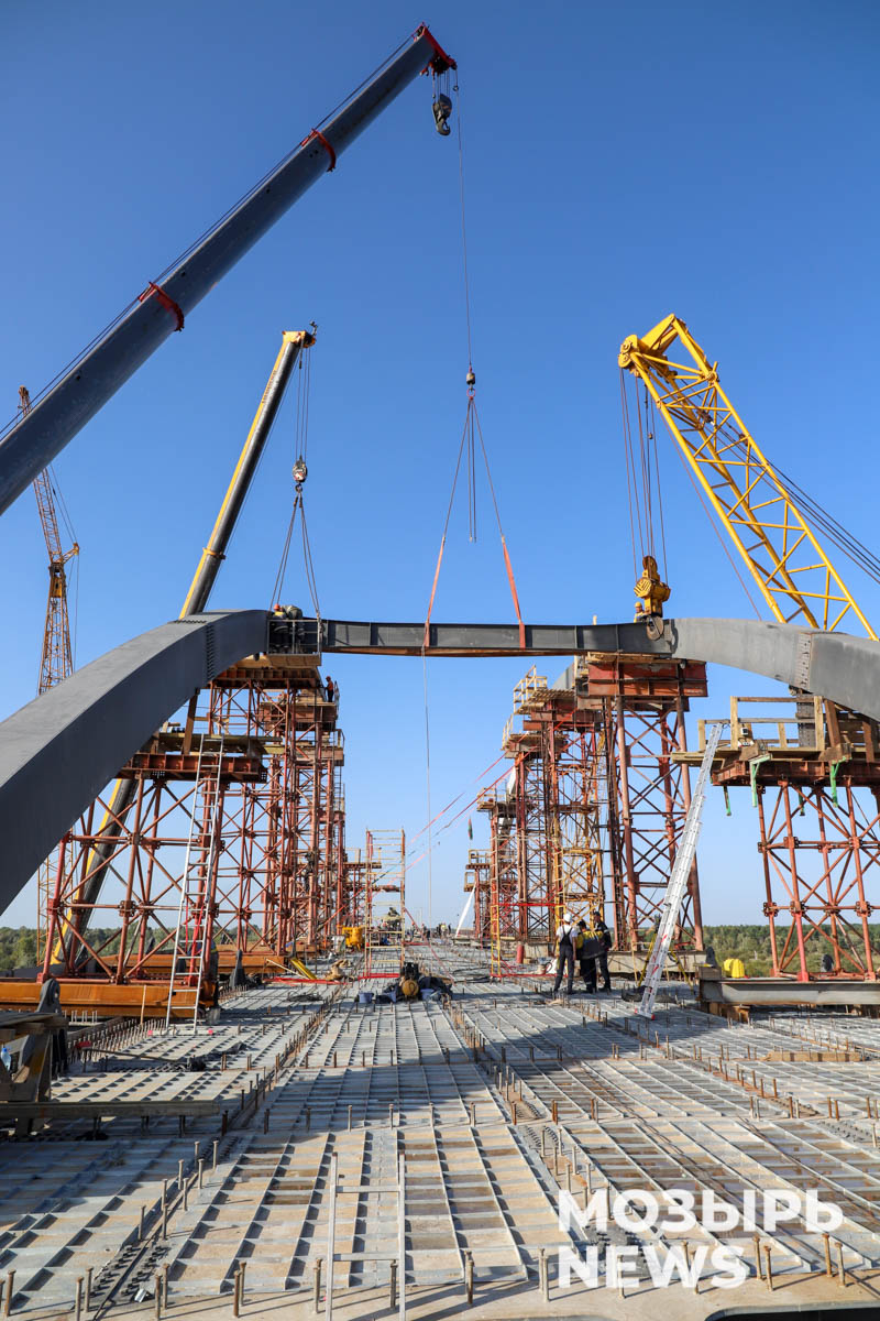 Одна из примет сегодняшнего времени: когда рейсовые автобусы спускаются с улицы Рыжкова или поднимаются на нее, взоры всех пассажиров устремляются на мост, где происходит самое зрелищное действо – сборка новых металлических арок. Но не только стальными конструкциями живет сегодня этот самый грандиозный в истории Мозыря объект, о чем мы и узнали, посетив стройплощадку.