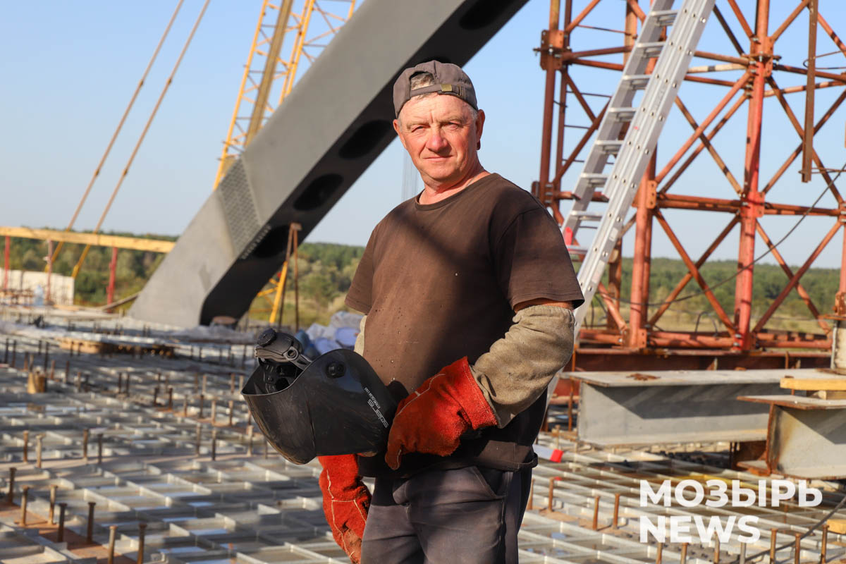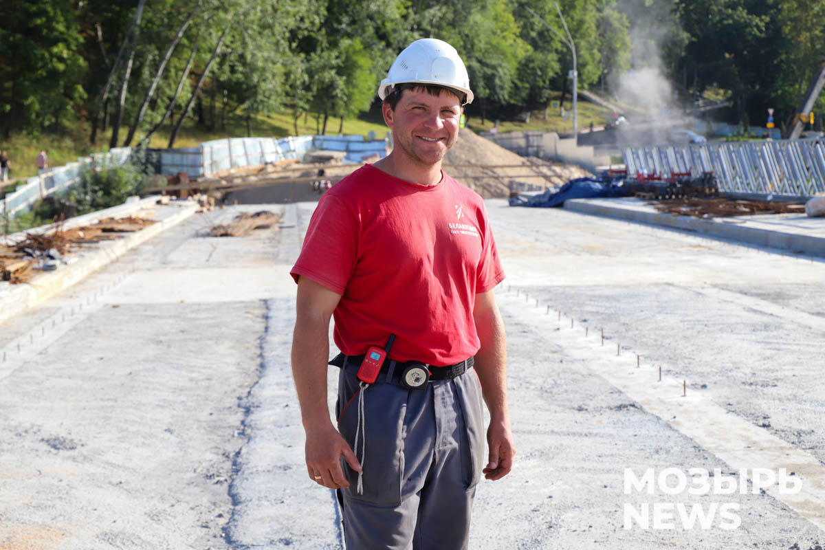 На левом берегу установлены мачты фонарного освещения, свет обеспечат мозырские специалисты филиала «Электромонтажного управления № 4» ОАО «Белэлектромонтаж». Мы уже рассказывали о мозырянах – участниках реконструкции моста, но нам повезло встретить еще одного земляка. Мозырянин Николай Радовня работает бетонщиком в МСУ № 6 в г. Минске.