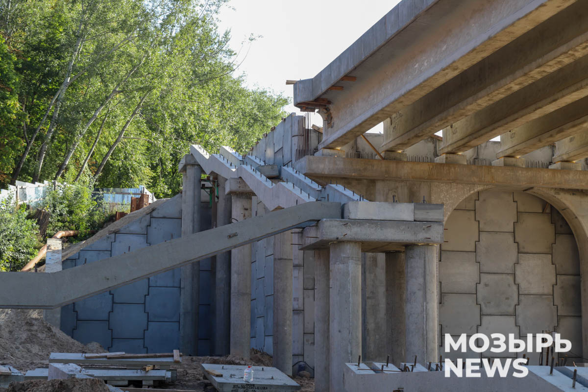 «21 августа генеральным подрядчиком ОАО «Мостострой» смонтирована последняя, 175-я, железобетонная балка пролетного строения, – вводит нас в курс дела Владимир Леонидович. – Завершается возведение подпорной стенки и насыпи у 27-й опоры, ведется строительство лестниц. «Дорожно-строительное управление № 10» из Калинковичей выполняет работы по благоустройству прилегающих территорий и улиц.