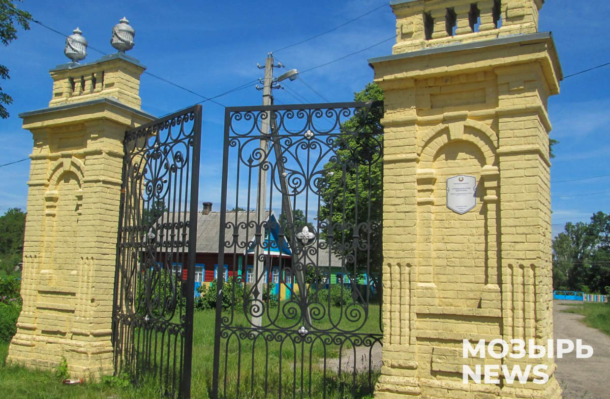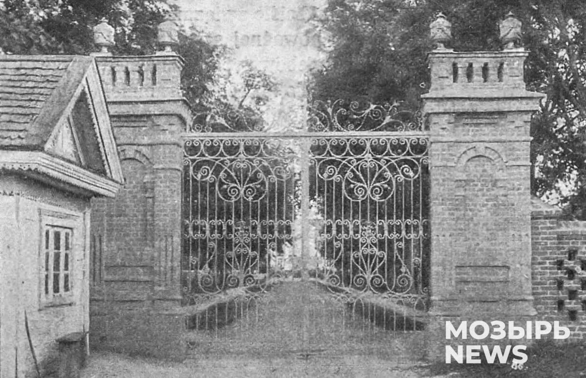 На пилоны навешаны кованые створки ворот с изысканным орнаментным изображением. Место рядом занимала маленькая сторожка. По другую сторону парка на одном из холмов находилась фамильная часовня-усыпальница. Главная аллея парка пролегала вблизи высокого берега реки и ее поймы. Отсюда виднелись остатки замка Оскерков в Юровичах. На мысе стояла беседка, из которой открывались прекрасные пейзажи на заречный ландшафт Припяти.