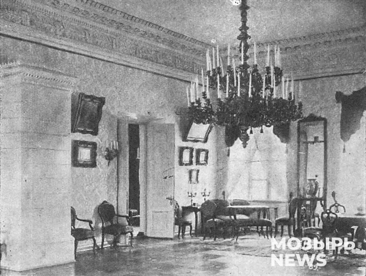 Широкая река поблизости и небольшое озеро сразу за дворцом составляли эффектное природное окружение. На высоком берегу Припяти был разбит пейзажный парк площадью около 5 гектаров. Его композиция состояла из двух частей: нижняя, южная, с дворцом посередине и высокая, западная, с садом, вытянутым вдоль излучины реки. К дому вела липовая аллея с каменным арочным мостом через небольшой ручей (остатки бывшего рва). За мостом стояли ворота в виде двух построенных из кирпича неоштукатуренных пилонов, увенчанных балюстрадами и вазами с гирляндами.