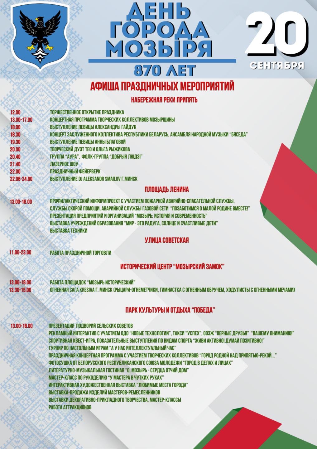 «В связи с празднованием 870-летия города Мозыря планируется проведение различных мероприятий, – говорит Сергей Зайковский. – Торжественная часть начнется в 12.00 на набережной реки Припять. Традиционное чествование ветеранов труда, добросовестных тружеников района, трудовых династий будет чередоваться с творческими номерами в исполнении приглашенных артистов – звезд белорусской эстрады. Сюрпризом станет участие в церемонии рыцарей. Завершится торжественная часть красивой финальной песней. Подпевать будут и зрители.