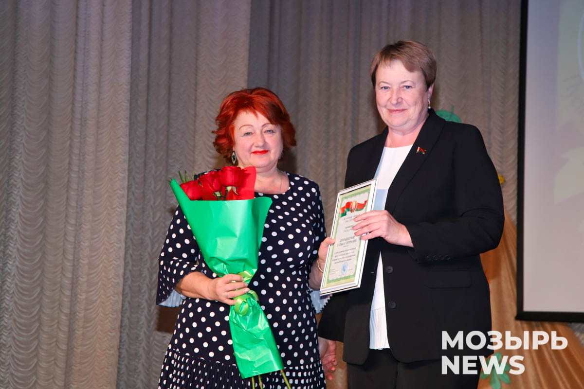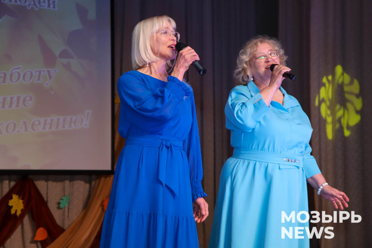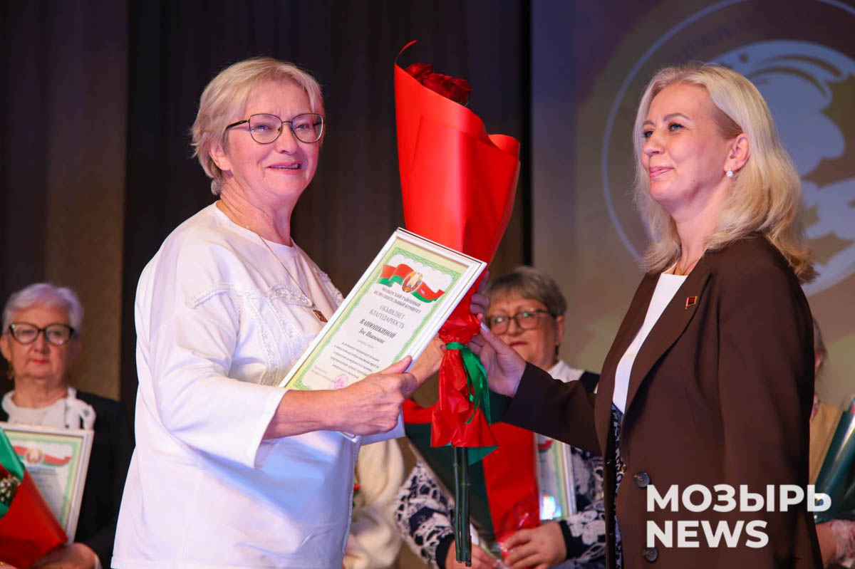 Далее Галина Михайловна открыла церемонию награждения Благодарностями Мозырского районного Совета депутатов и Мозырского райисполкома. Приятную миссию продолжила начальник управления по труду, занятости и социальной защите райисполкома Наталья Ермаковец. За многолетний добросовестный труд, высокий профессионализм, образцовое выполнение должностных обязанностей награды получили Наталья Баранова, проработавшая 20 лет в должности главной медицинской сестры психонаркологического диспансера; Елена Оленева, педагог отдела образования; Лидия Бельская, стаж работы в спортивных организациях города которой – 42 года; Анна Опочкина, ветеран труда управления по труду, занятости и социальной защите райисполкома и другие.Затем настало время музыкальных подарков. Свои лучшие песни участникам встречи подарили Валерий Тетерук, вокальная группа «Родники», народный ансамбль музыки «Мазырскія гармонікі», Оксана Гайдукова и Елена Противенская (дуэт «Ренессанс»), вокальная группа «Орфей», солисты Александр Телепун, Елена Гаркуша, дуэт «Славяне», вокальный ансамбль «Медуница», дуэт Трифонов/Сысоева и другие. Получился очень добрый, теплый и искренний праздник.