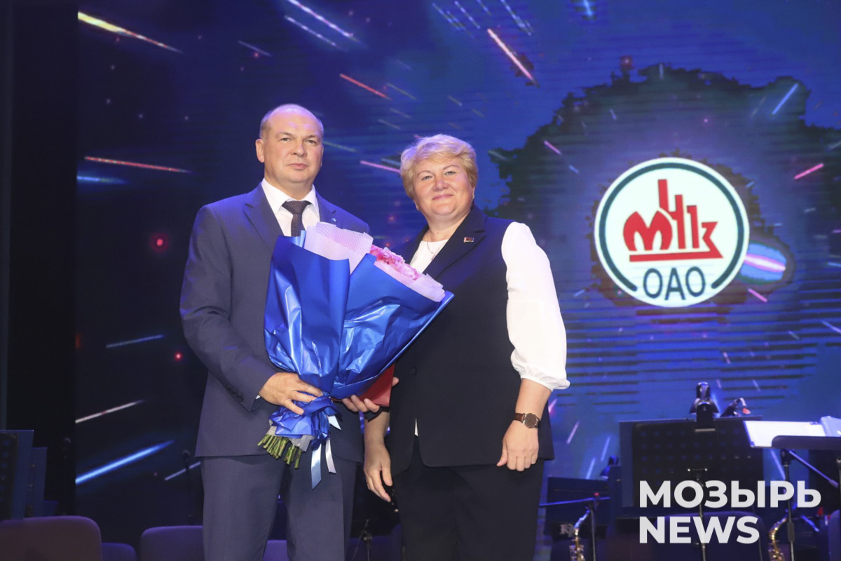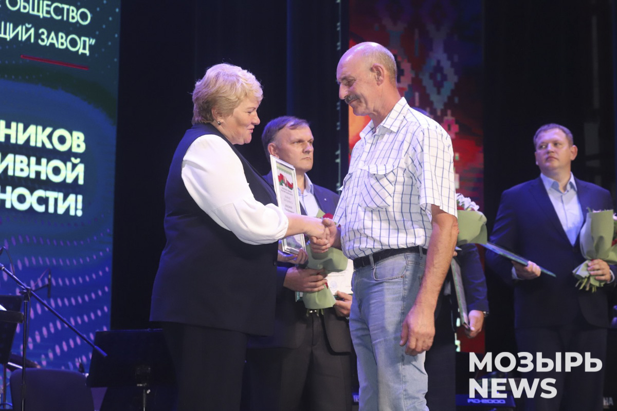 Праздник продолжился церемонией награждения работников, чей вклад отмечен на областном и районном уровнях. За высокий профессионализм и особый вклад в развитие предприятие работников завода поздравили председатель Мозырского райисполкома Елена Павлечко и председатель Мозырского районного Совета депутатов Галина Кудина.