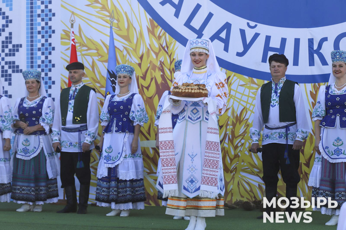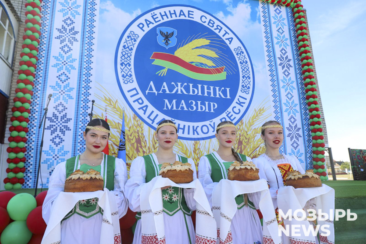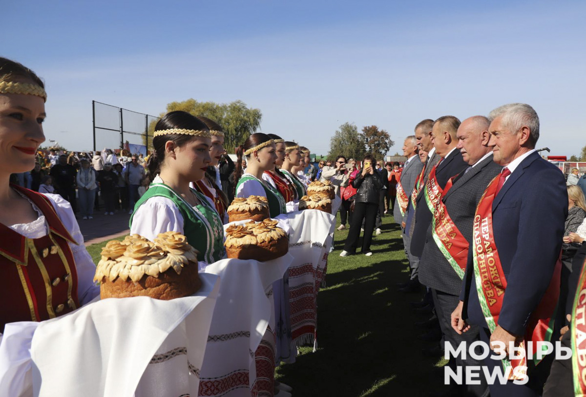 Главный дожиночный каравай урожая 2025 года, как символ богатства и достатка, выращенный золотыми руками наших тружеников, был вручен председателю Мозырского районного исполнительного комитета Елене Павлечко. Одновременно хлебный каравай был преподнесен всем руководителям сельскохозяйственных предприятий района в качестве благодарности за великий труд коллективов сельхозпредприятий.
