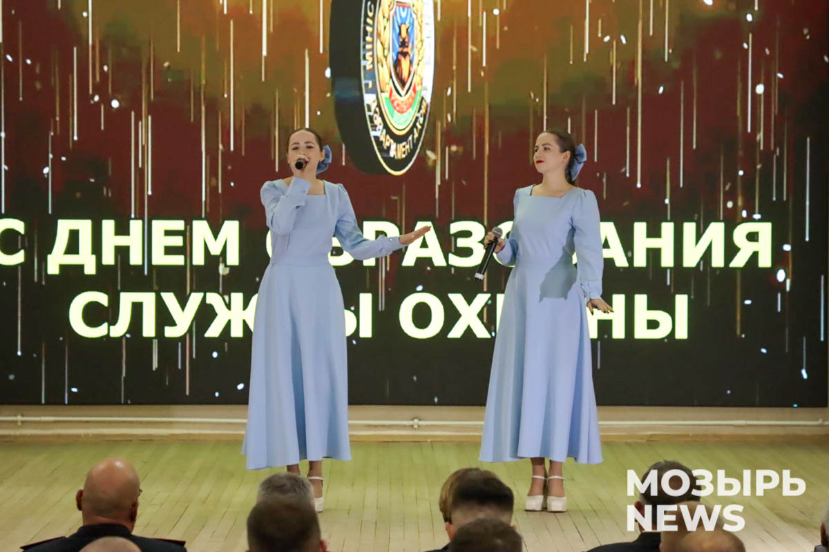 На сцену были приглашены председатель первичной ветеранской организации Мозырского отдела Департамента охраны Сергей Пугачев и ранее возглавлявший отдел Владимир Ранчинский. Они поздравили сотрудников с днем образования службы охраны и пожелали счастья, здоровья и успехов в их нелегком труде, отметив важность их работы для обеспечения безопасности и защиты граждан.