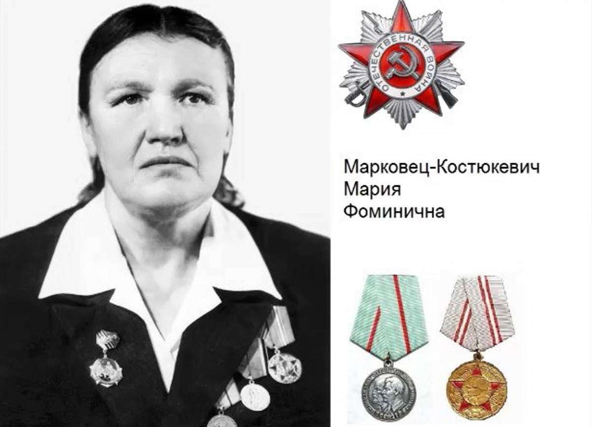 Сестра моего прадеда Мария Фоминична Марковец (Костюкевич), 1921 года рождения, во время войны, рискуя жизнью, работала санитаркой в партизанском госпитале.