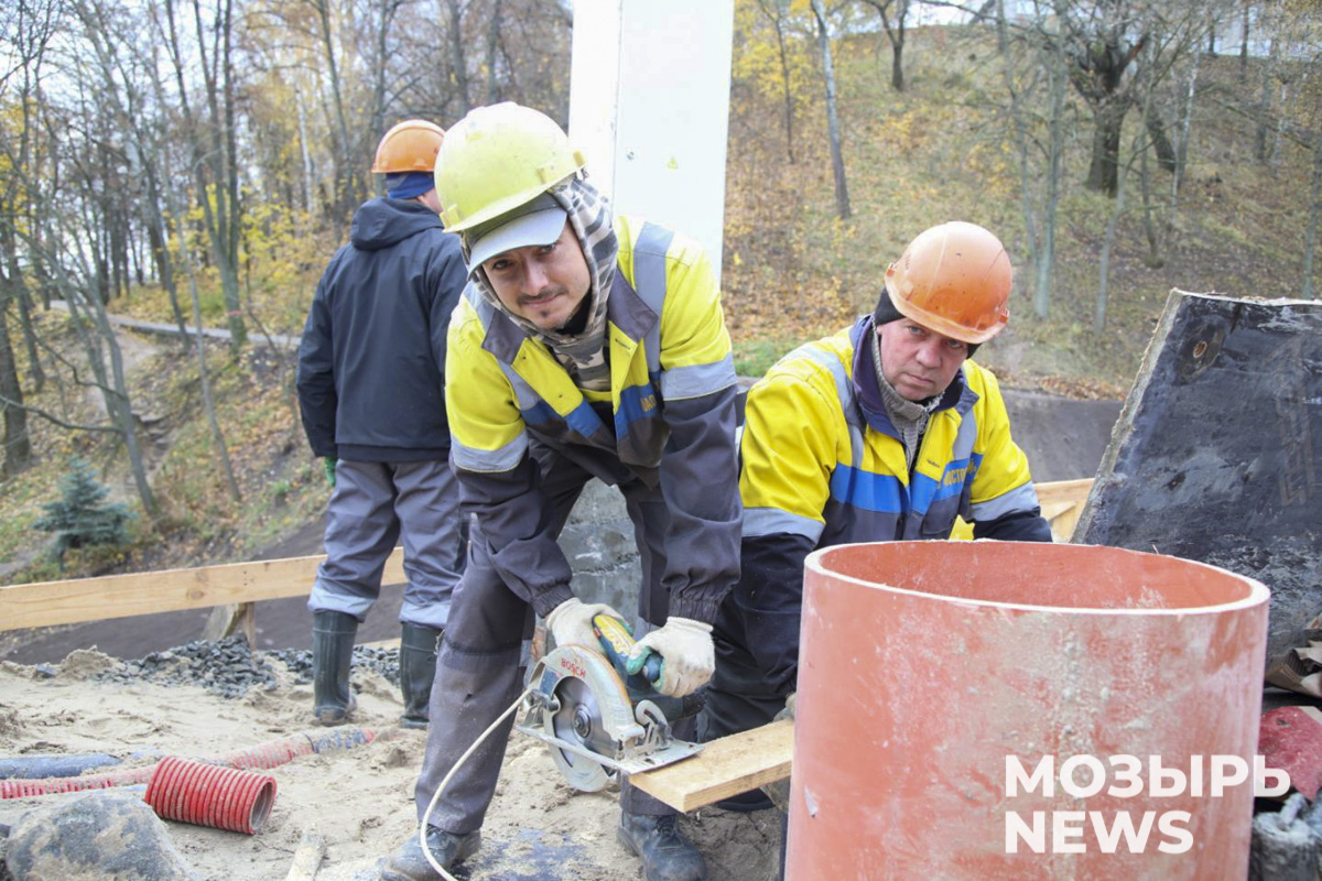 В самом начале работ ООО «Никова» сделало переустройство водопровода на площади Примостовой. Мачты освещения – это сфера деятельности филиала «Электромонтажное управление № 4» ОАО «Белэлектромонтаж». К работам по укреплению правого берега сегодня подключился ОАО «Трест Белсантехмонтаж № 1». Коммунальники приводят в порядок прилегающую к мосту территорию, удаляя кустарниковую растительность, мусор, оставляя деревья. Обустройство наружных сетей ливневой канализации – заслуга ОАО «Мозырьпромстрой».