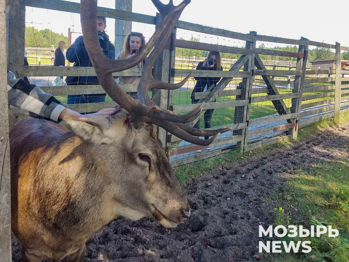 Паровоз привез нас в контактный зоопарк, где нас встретили полесские лошади, которые несут в себе гены вымерших тарпанов. Они оказались весьма дружелюбными. Также здесь проживает настоящий лесной олень Кузя. Правда, к моменту нашего прихода он спал и был недоволен, что его разбудили шумные посетители. Кузя давал себя гладить – его шерсть на ощупь очень жесткая. Когда прикосновения ему переставали нравиться, он начинал показывать характер. От больших рогов спасал только деревянный загон.