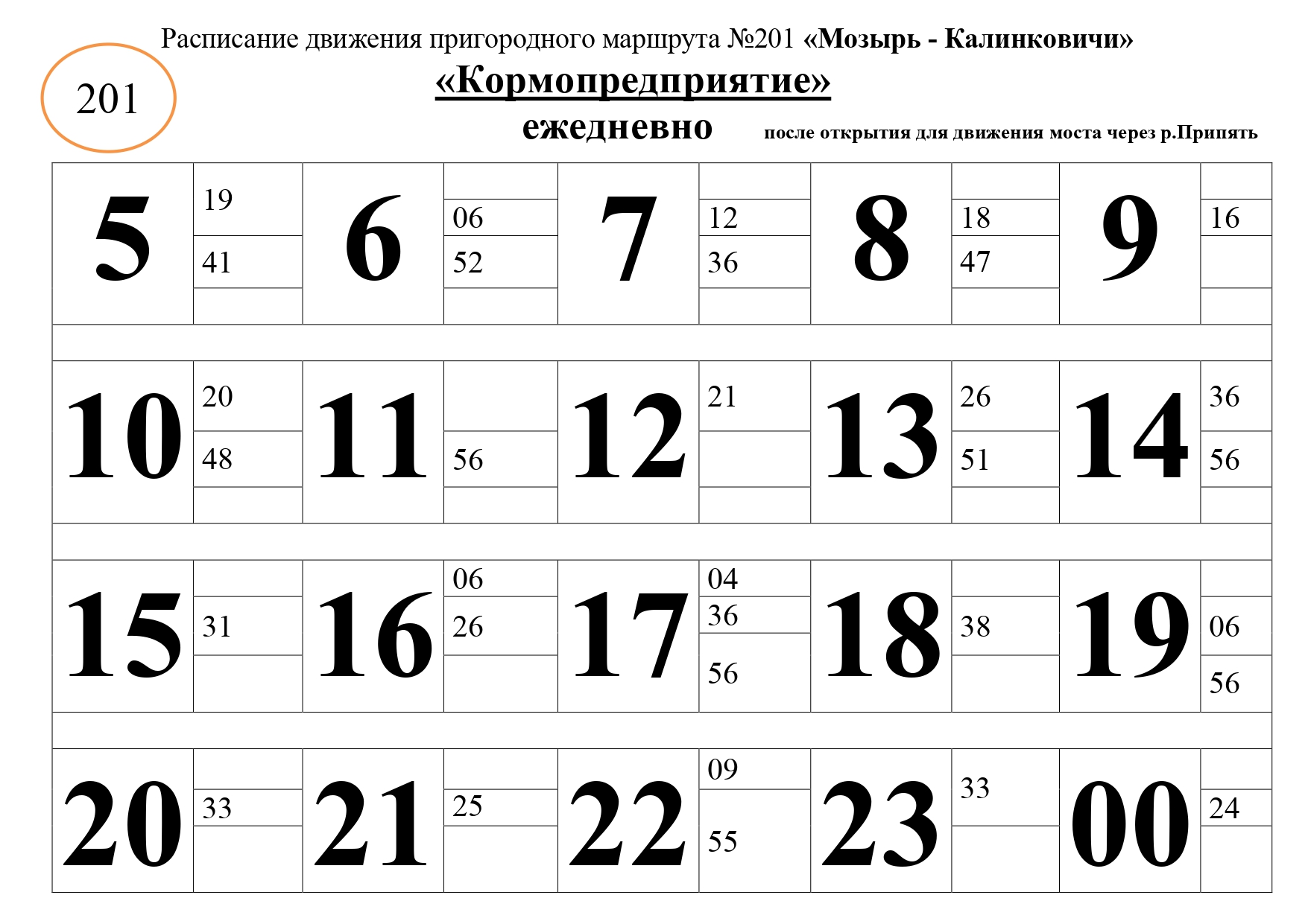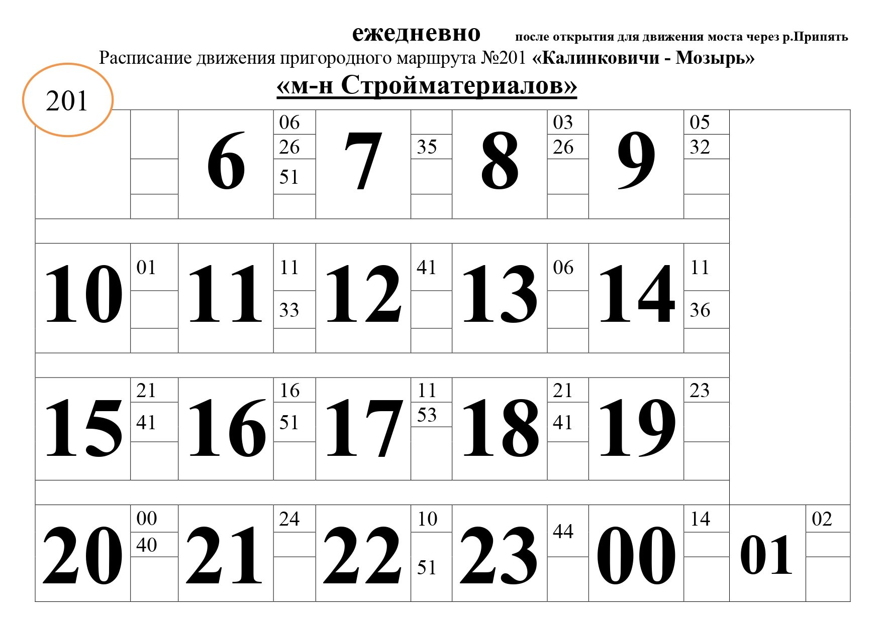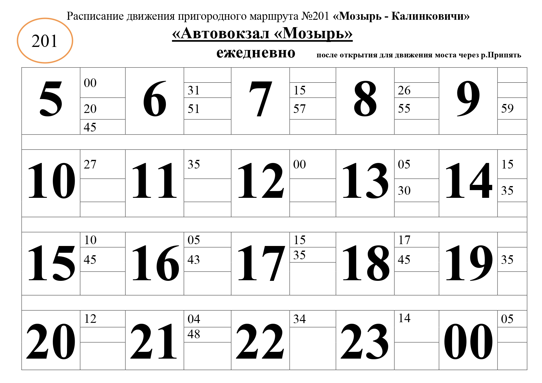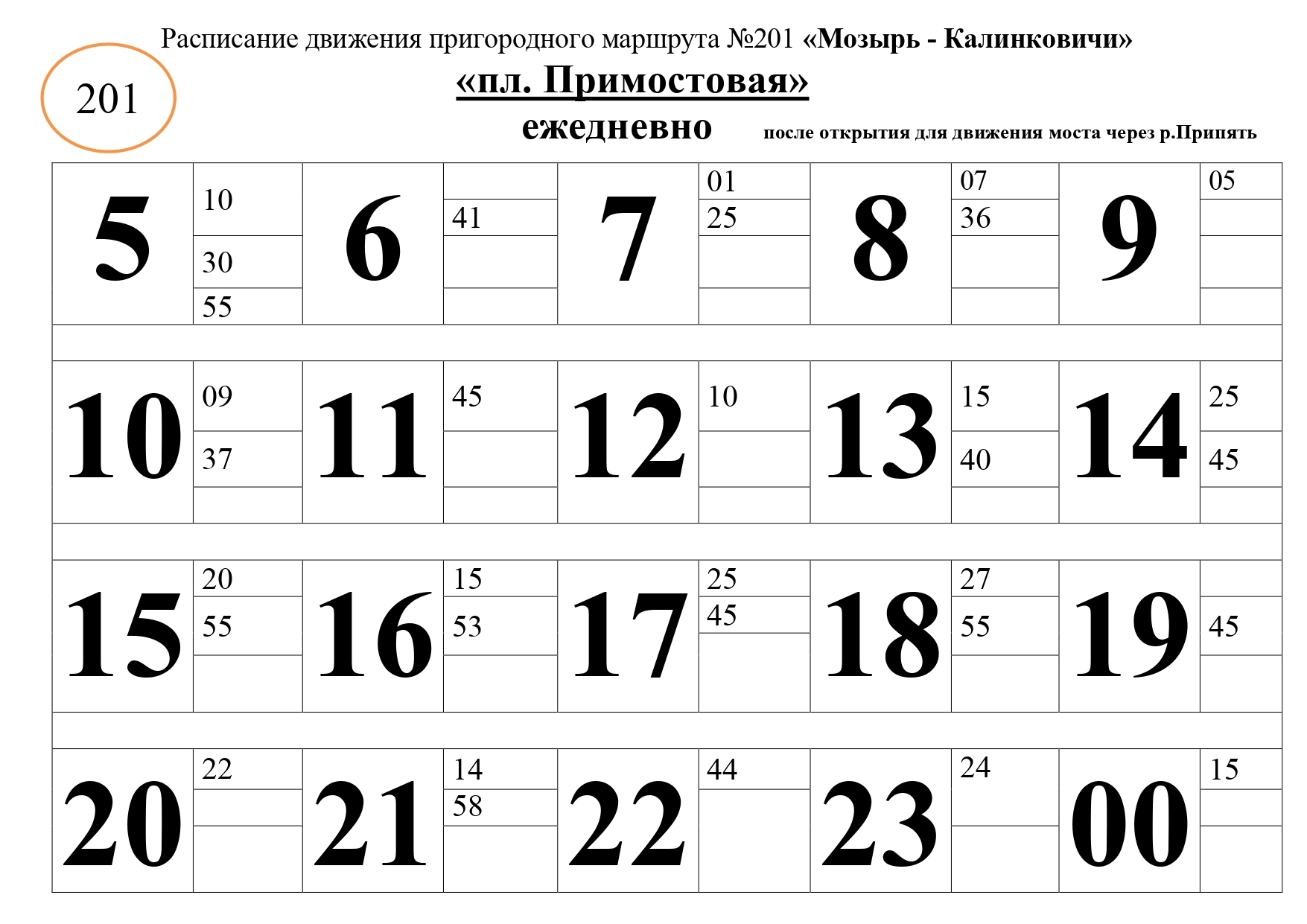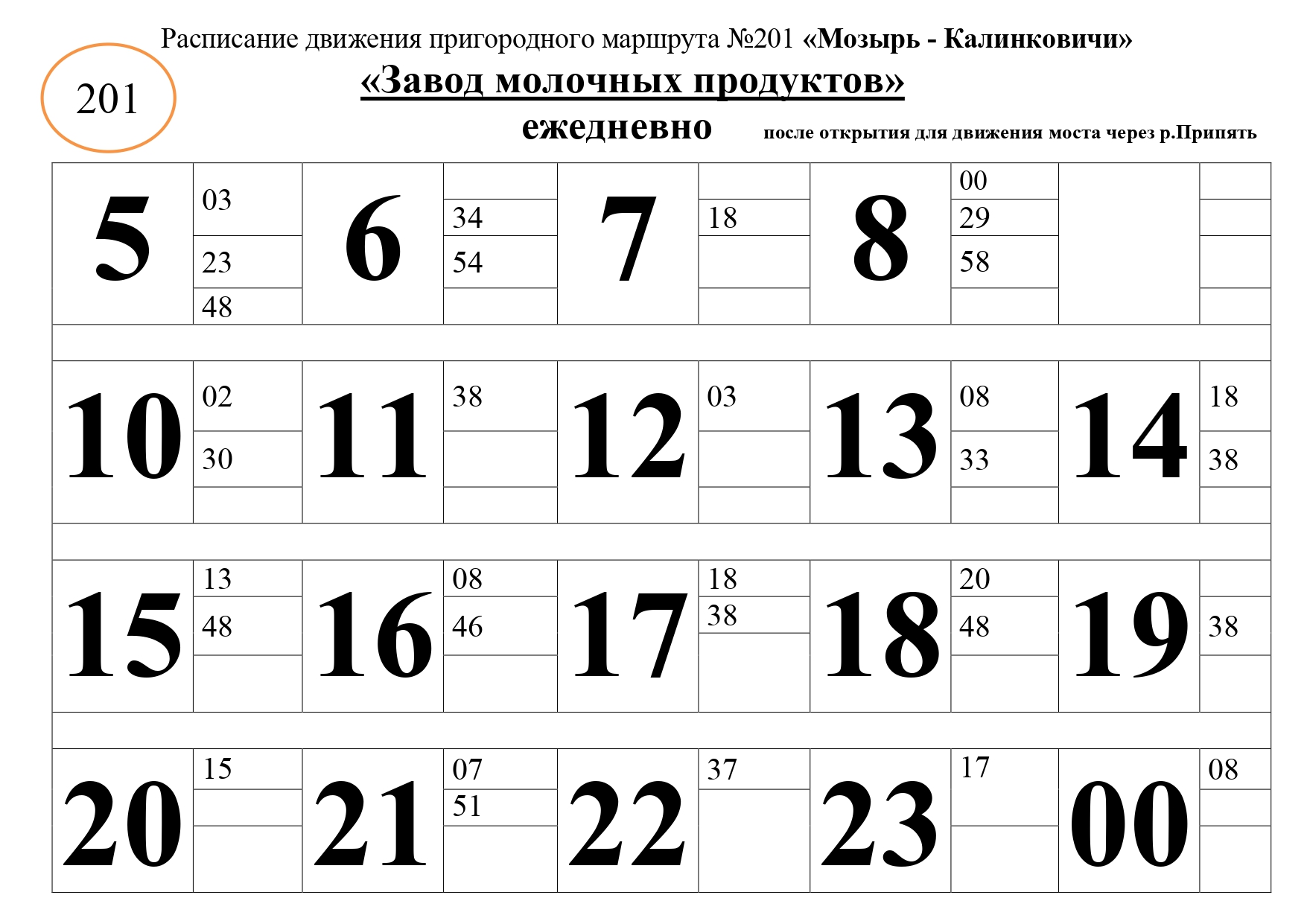 Расписание по остановкам автобуса №201 Мозырь-Калинковичи-Мозырь после открытия моста