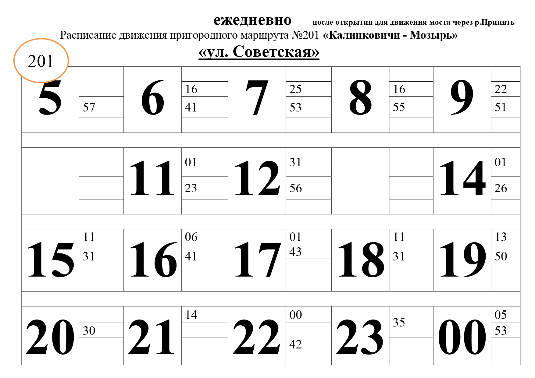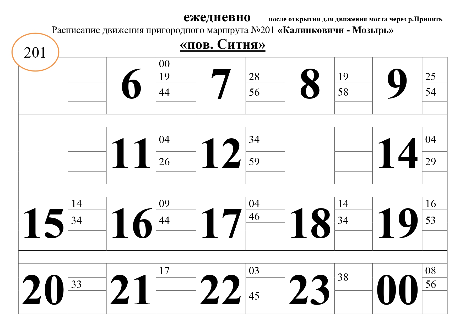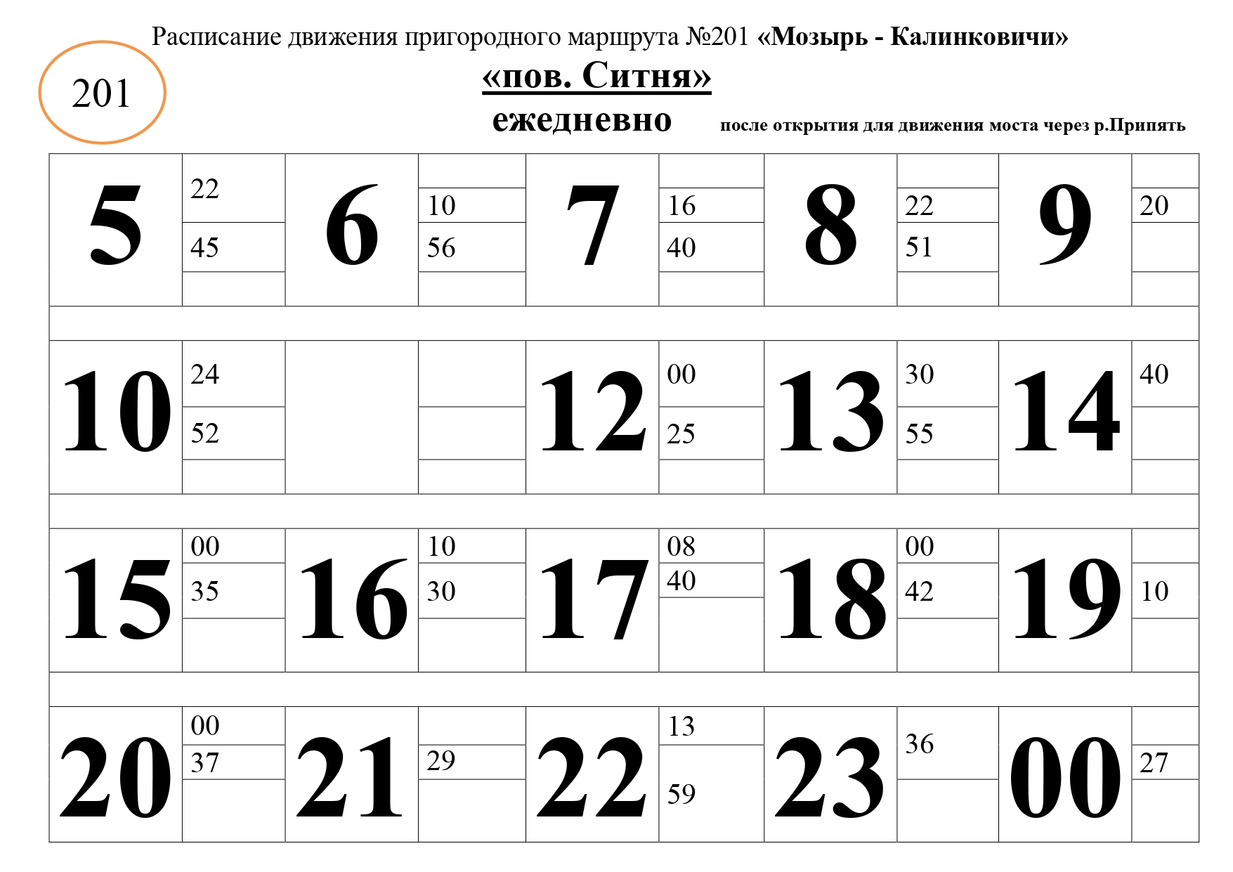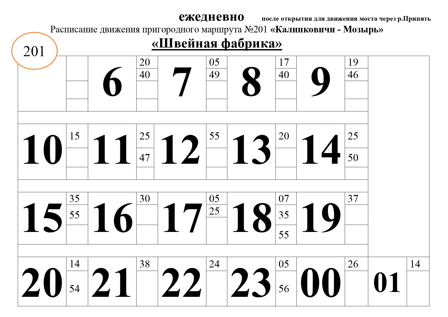 Расписание по остановкам автобуса №201 Мозырь-Калинковичи-Мозырь после открытия моста