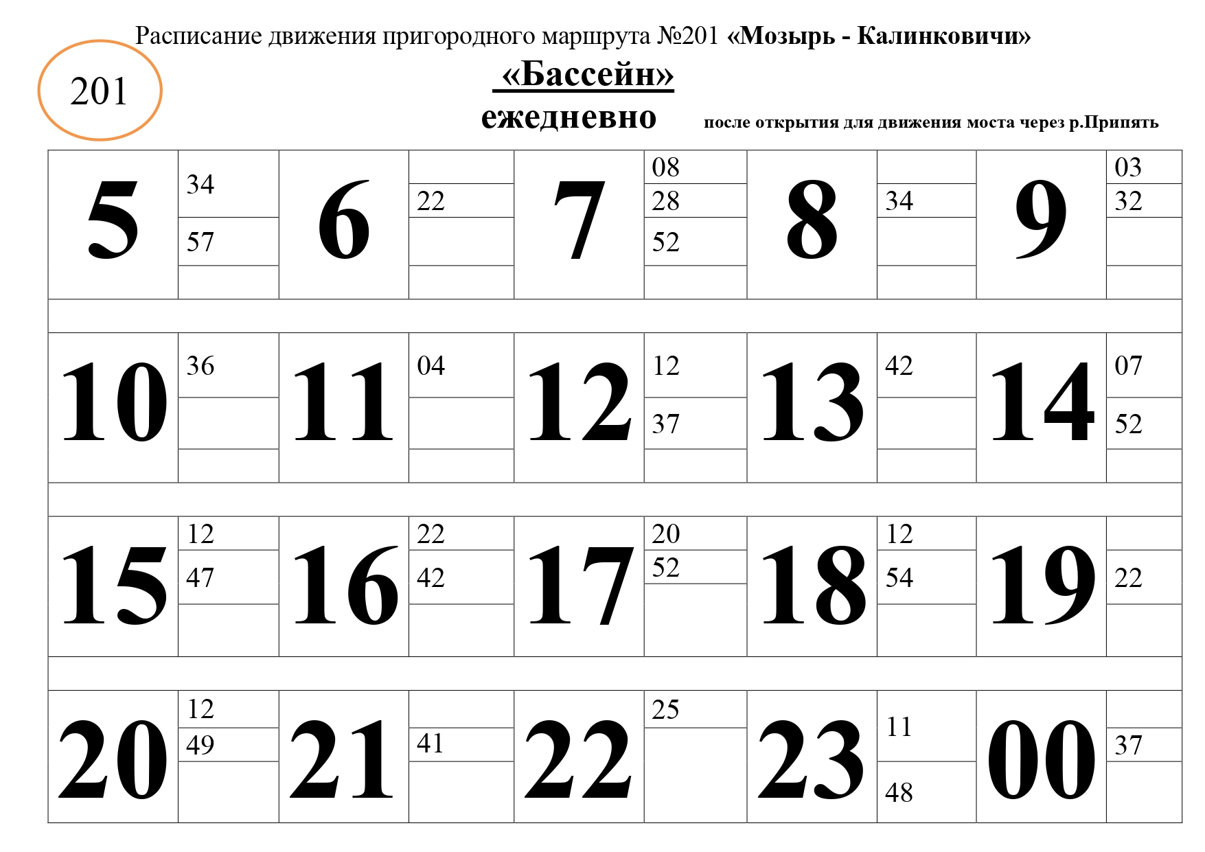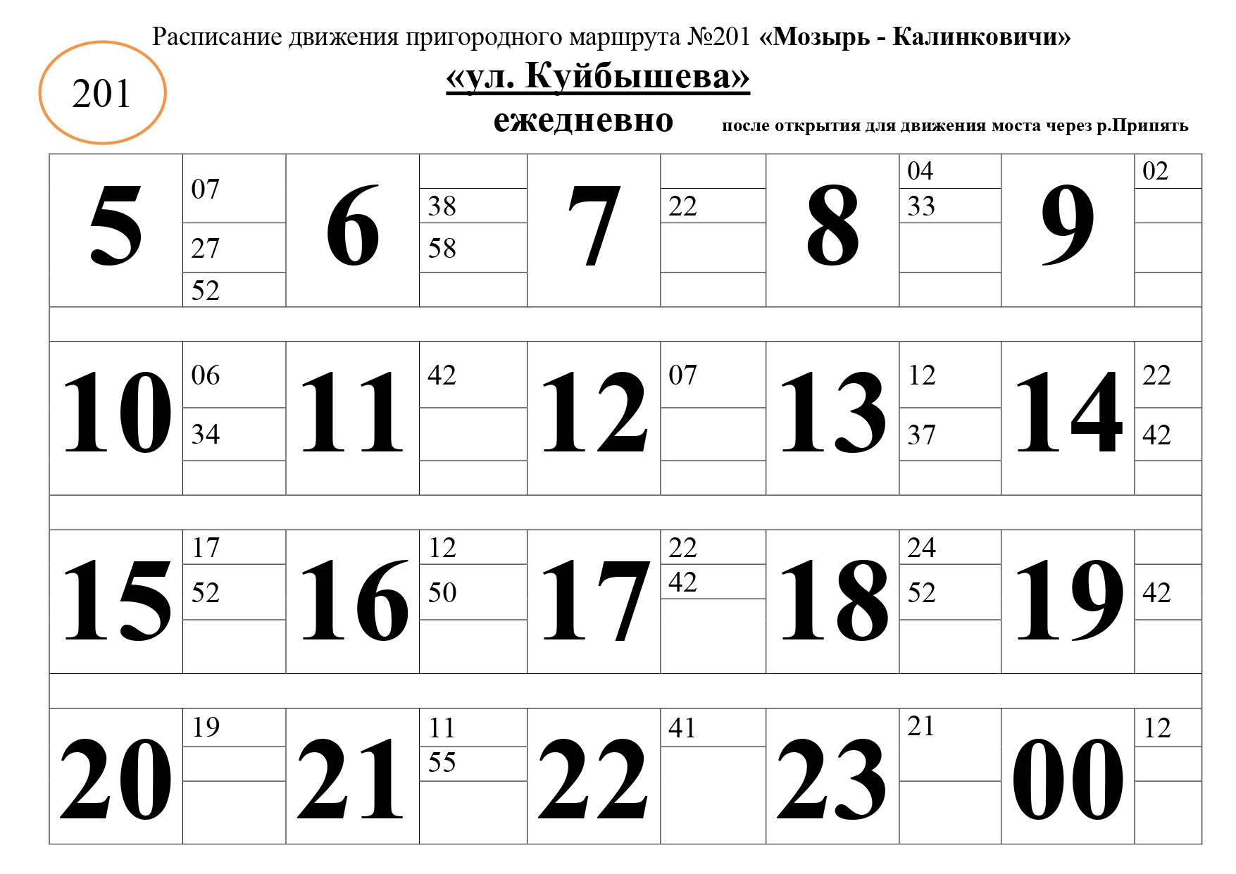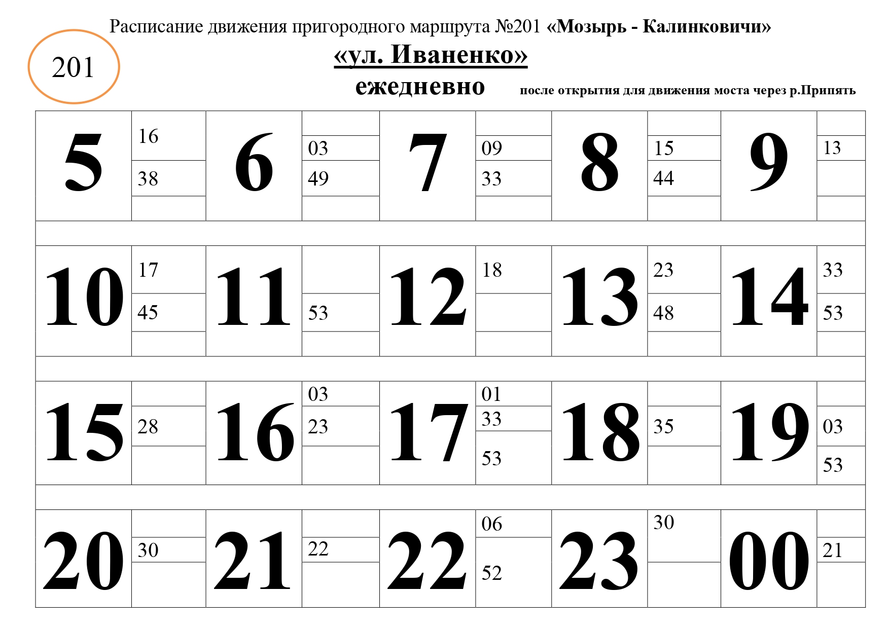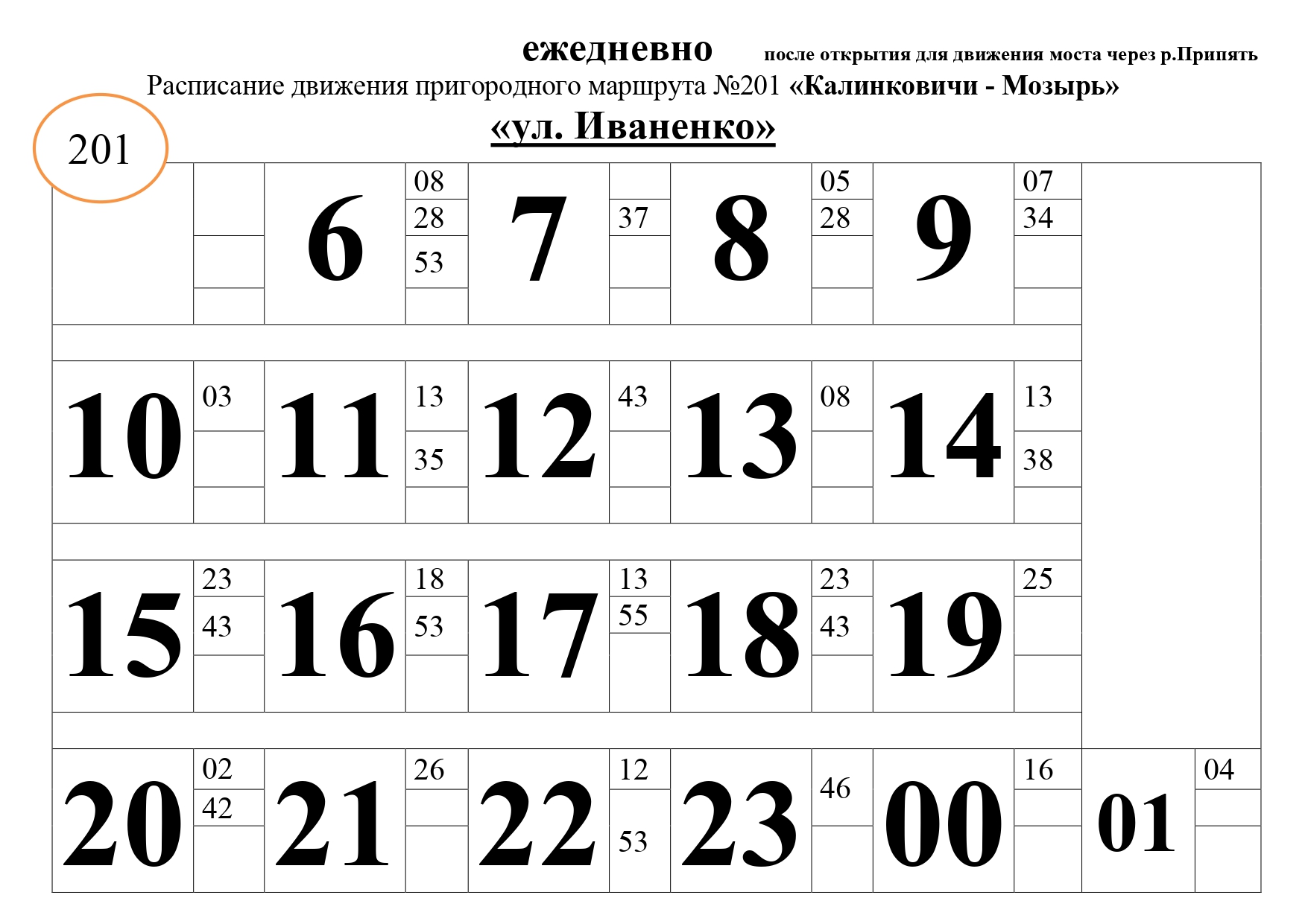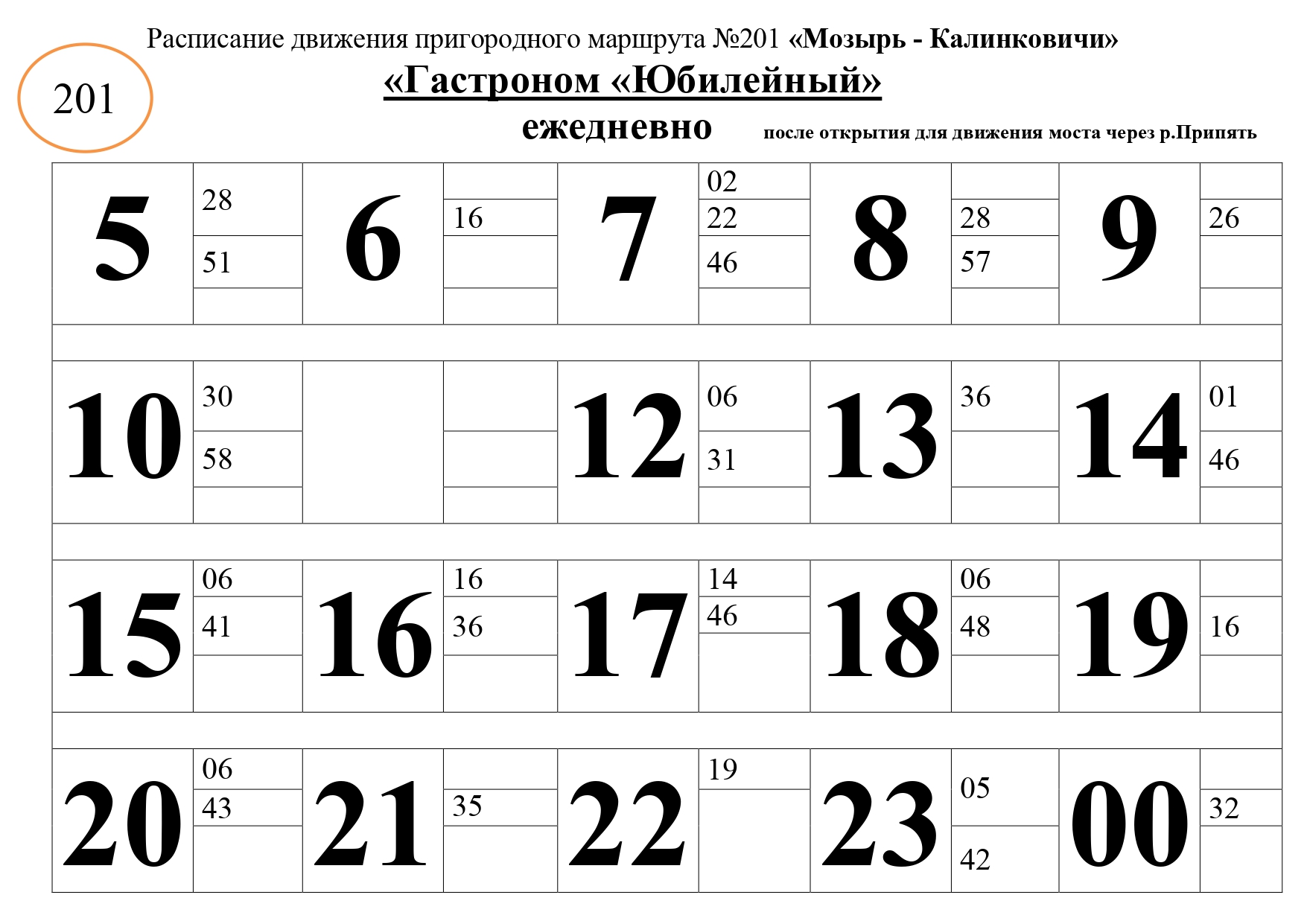 Расписание по остановкам автобуса №201 Мозырь-Калинковичи-Мозырь после открытия моста