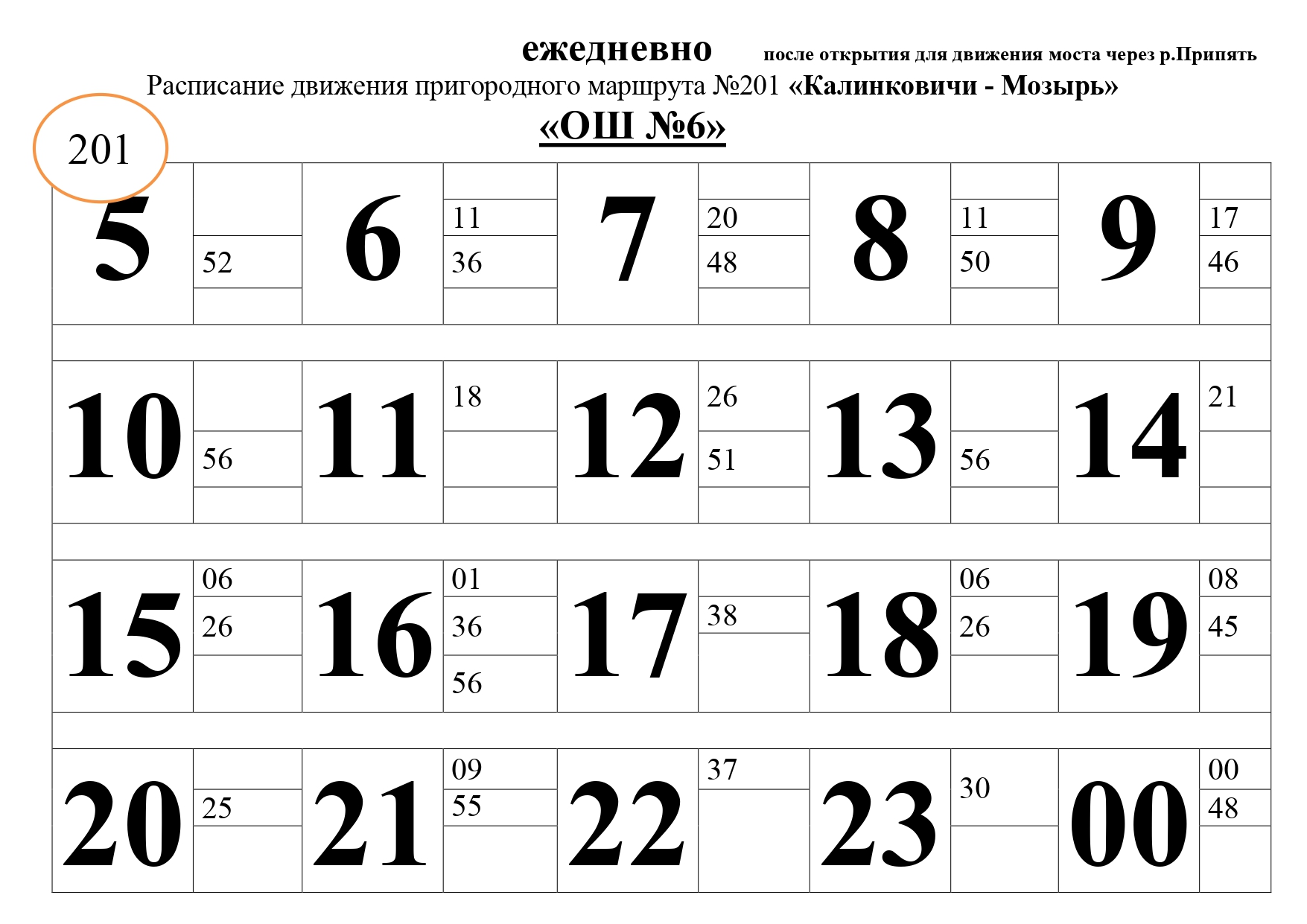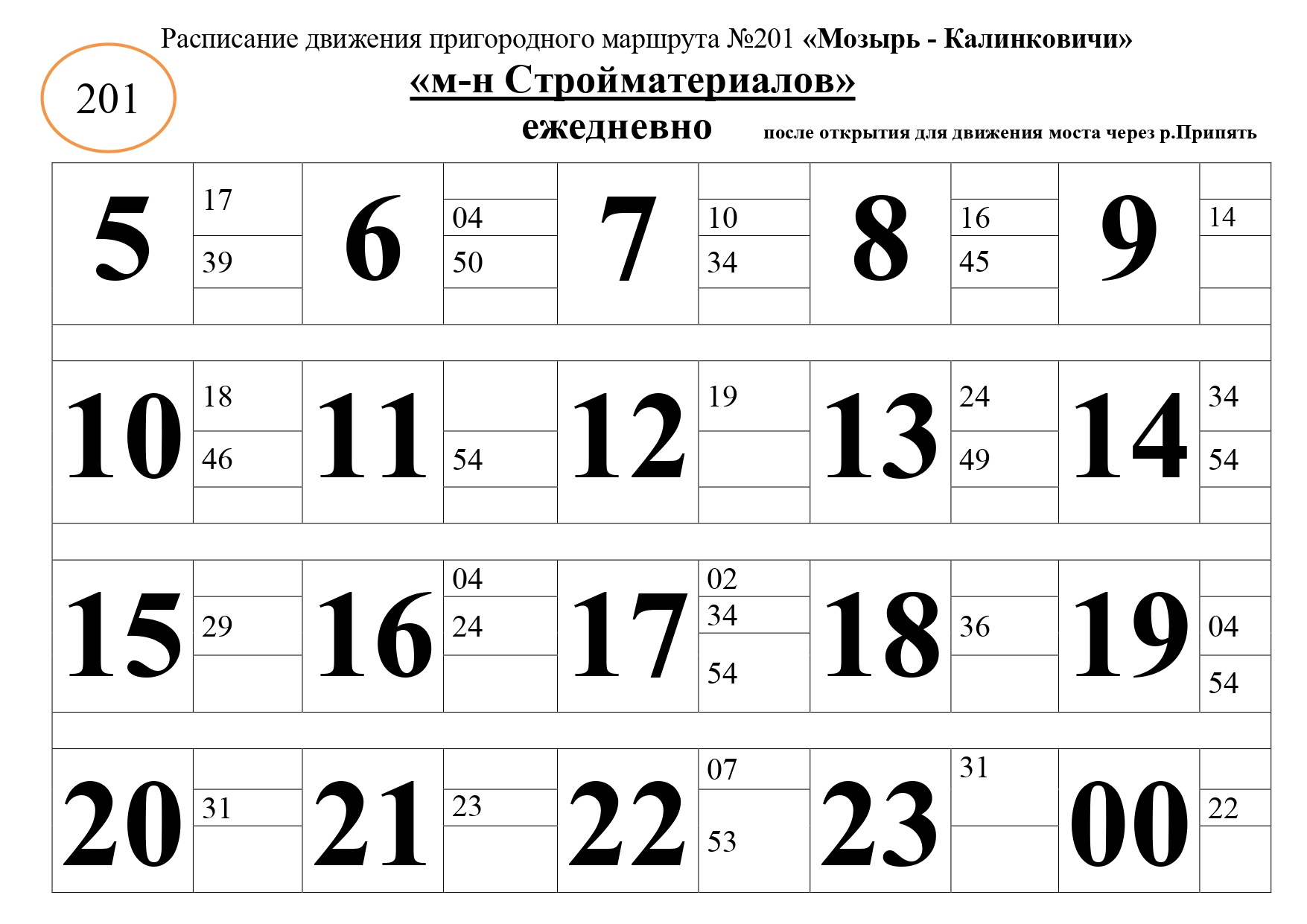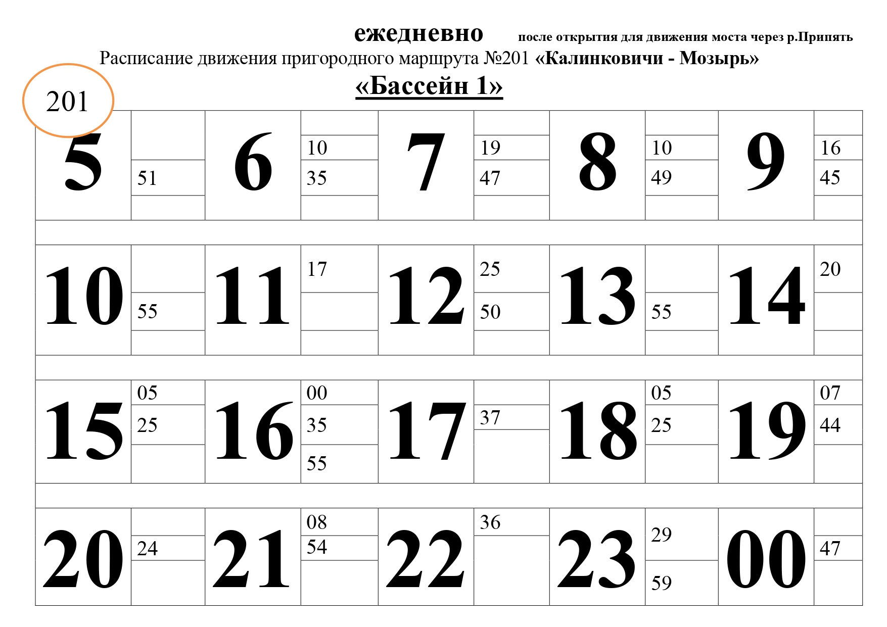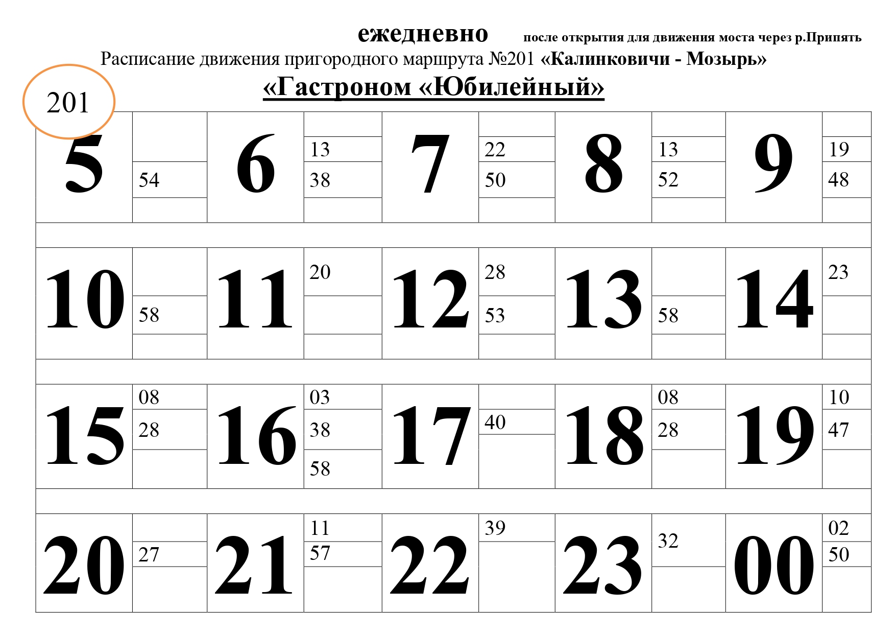 Расписание по остановкам автобуса №201 Мозырь-Калинковичи-Мозырь после открытия моста