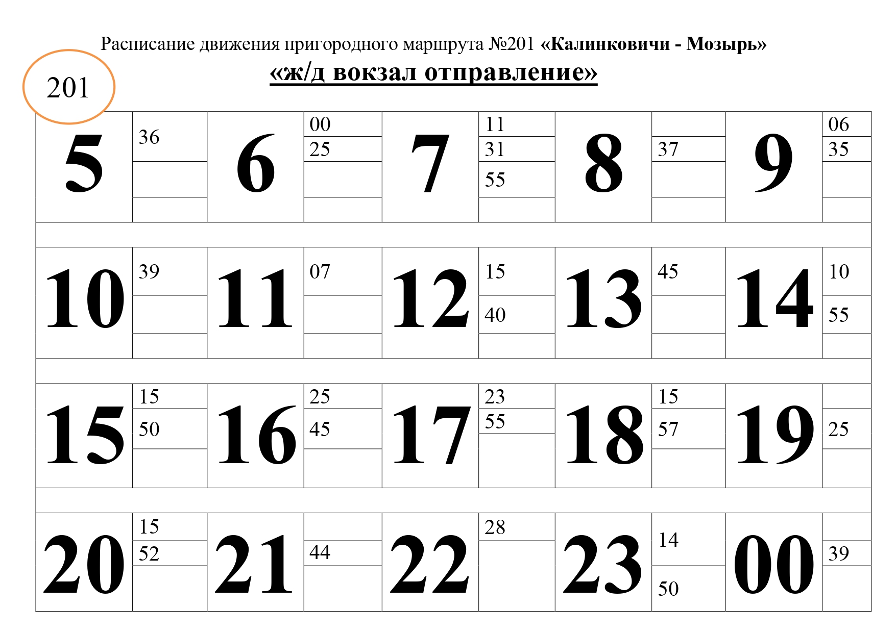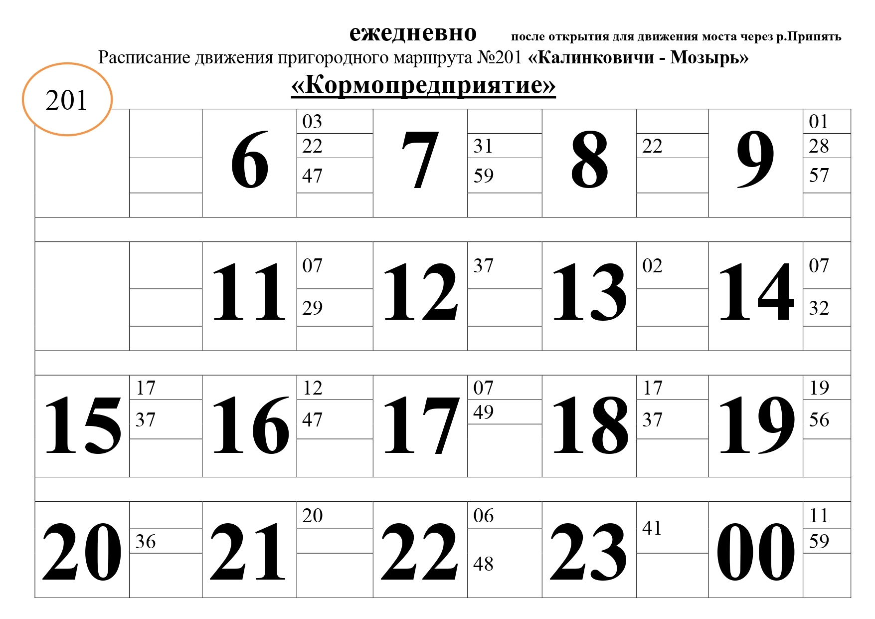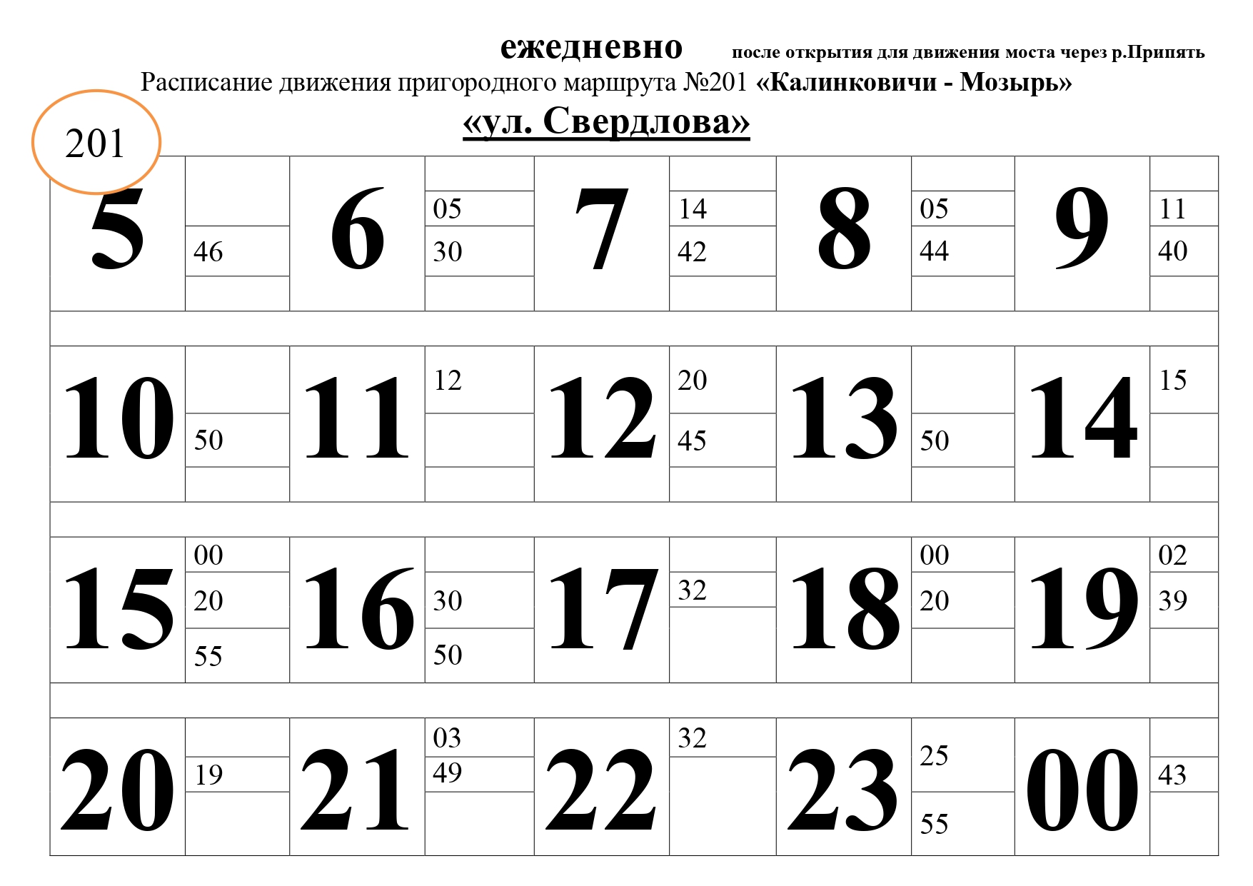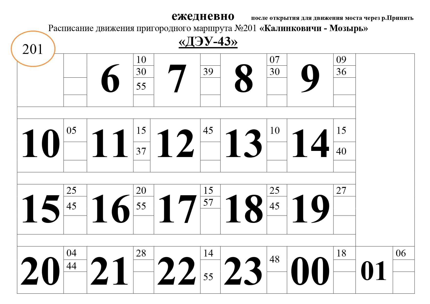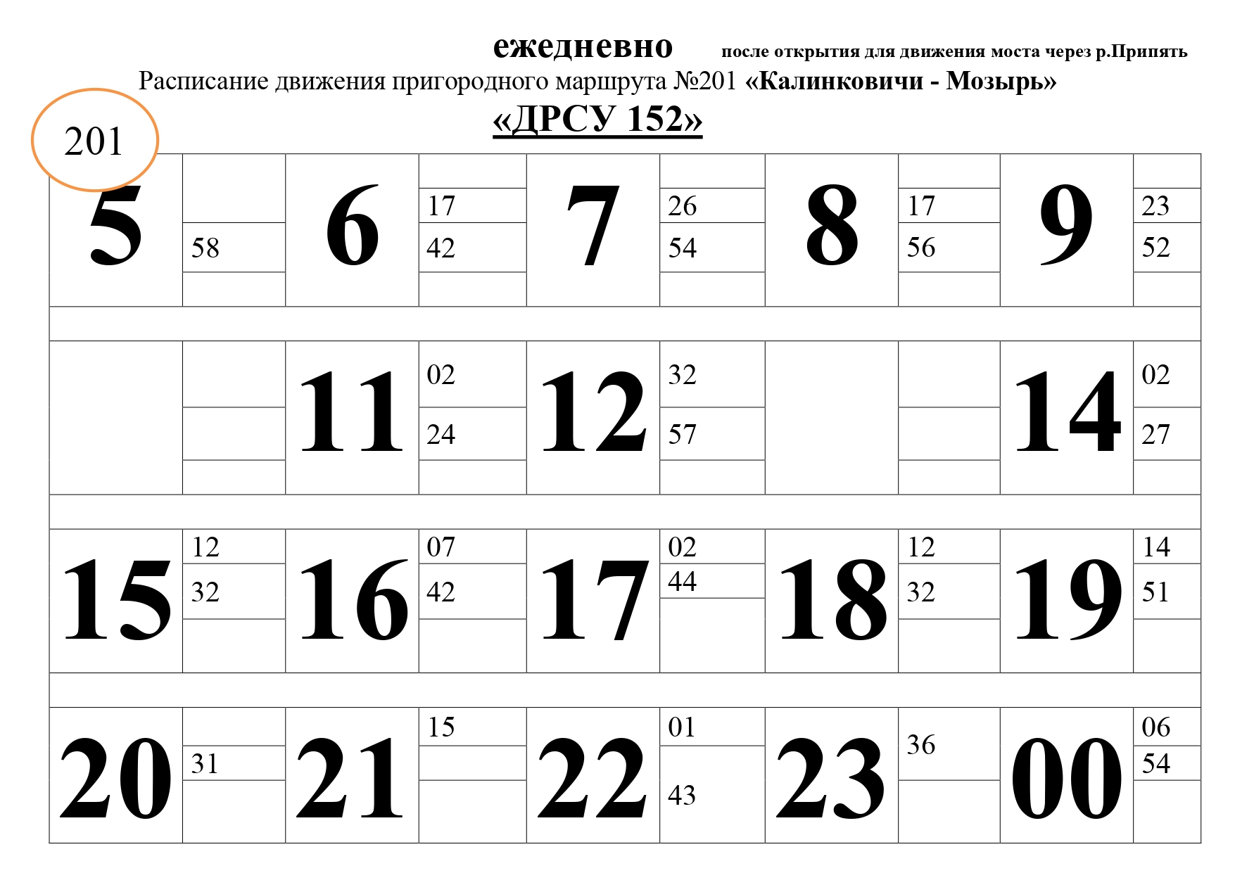 Расписание по остановкам автобуса №201 Мозырь-Калинковичи-Мозырь после открытия моста