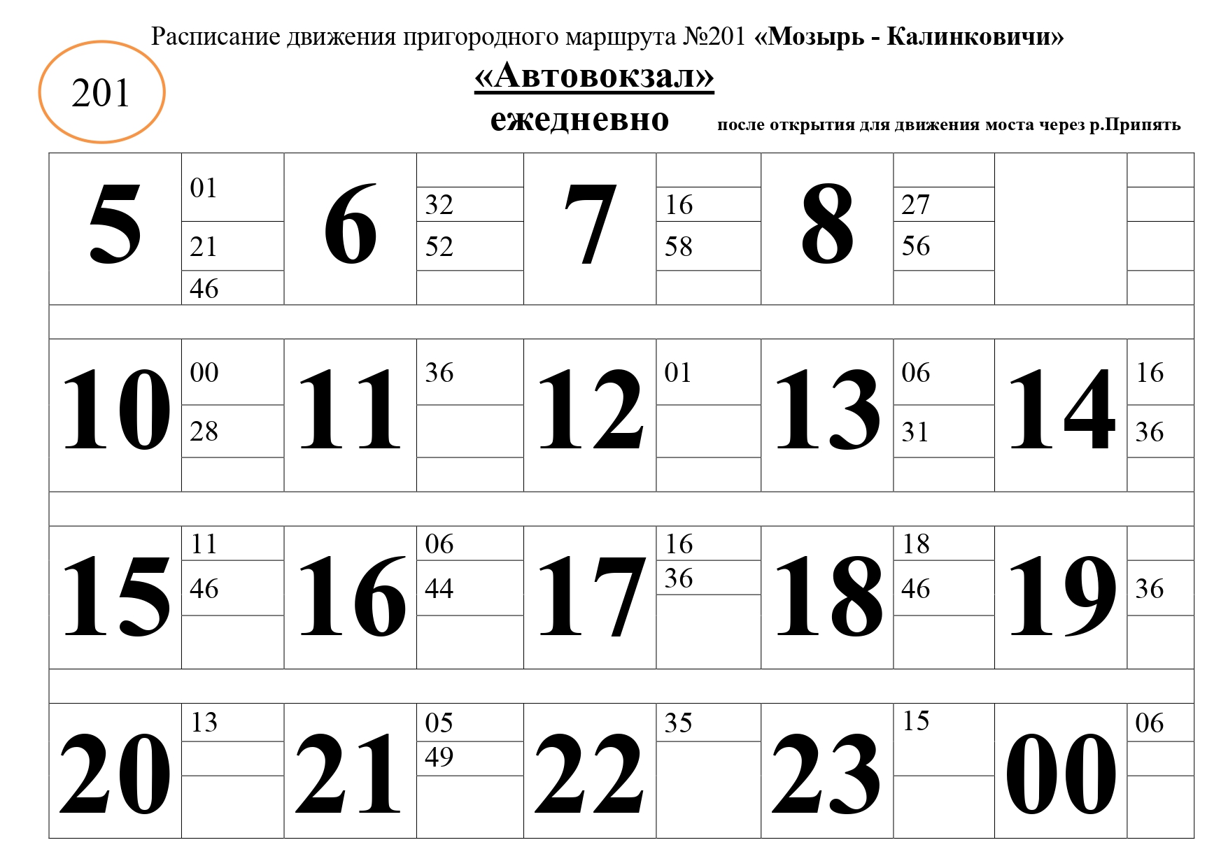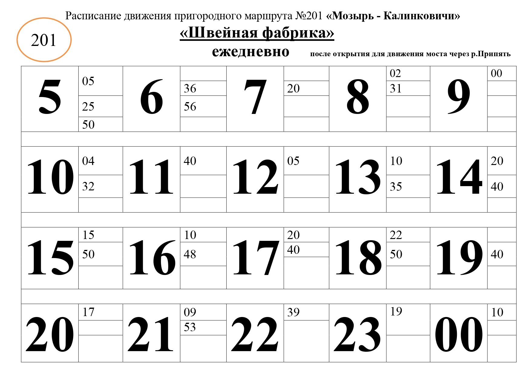 Пригородный маршрут № 201 будет осуществлять движение от автовокзала Мозыря по улице Пролетарской через остановочные пункты «Завод молочных продуктов», «Швейная фабрика», «Улица Куйбышева» с заездом на площадь Примостовую, а далее – через мост на железнодорожный вокзал города Калинковичи. Обратно – по такому же маршруту.