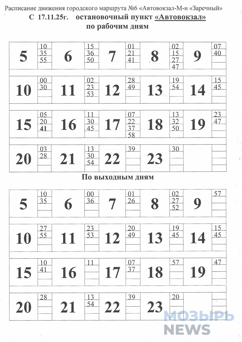 Расписание автобусов Новости Мозыря Расписание отправления автобуса № 6 с остановки «Автовокзал» 15 ноября, 2025 325 С 17 ноября вносятся изменения во время отправления автобуса «Автовокзал – микрорайон «Заречный».