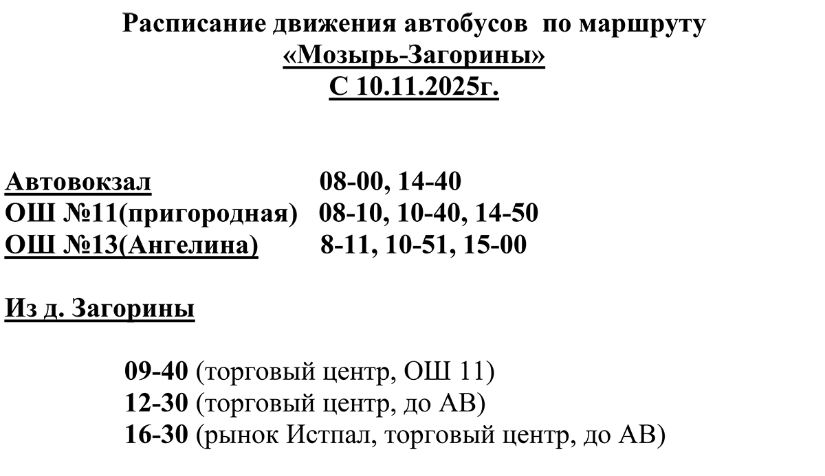 Отправления от АВ: 8-00 и 14-40, от ОШ № 11 в 08-10, 10-40 и 14-50 из д. Загорины в 09-40 (ч/з торговый центр до ОШ № 11), 12-30 (ч/з торговый центр до АВ), 16-30 (ч/з торговый центр до АВ).