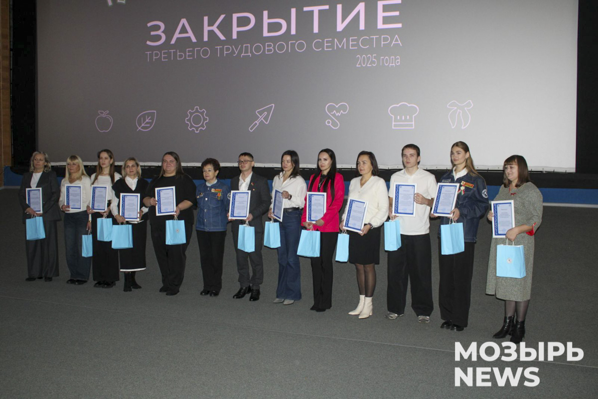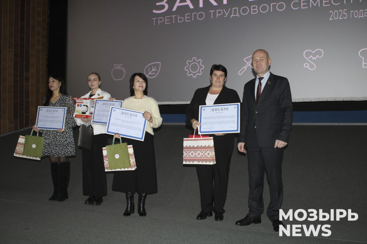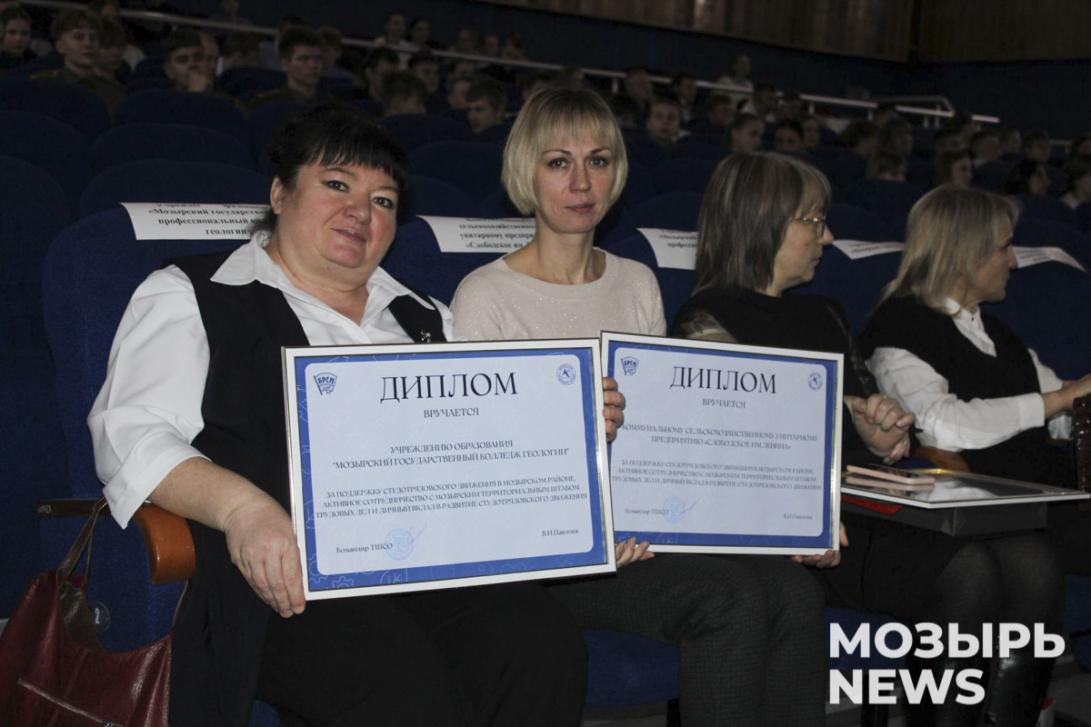Начальник отдела идеологической работе и делам молодежи Мозырского райисполкома Дмитрий Бондарев вручил дипломы Мозырского территориального штаба студенческих отрядов лучшим принимающим организациям – УО «Мозырский государственный медицинский колледж», Мозырскому монтажному управлению филиала ОАО «ТрестБелсантехМонтаж № 1», ООО «Полесьестрой-Стиль», КСУП «Экспериментальная база «Криничная», КСУП «Слободское им. Ленина»; лучшим направляющим организациям – УО «Мозырский государственный профессиональный колледж строителей», УО «Мозырский государственный профессиональный колледж геологии», а также лучшим студенческим отрядам – «Молот», «В ритме сердца», «Батарейка» и «Гаспадар».