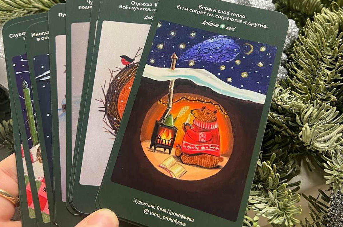 Тома Прокофьева известна своими добрыми, сказочными принтами. Для «Маленького волшебства» она создала серию иллюстраций: дом под снегом, лесные звери, зимние вечера, огонь в окне. На обороте каждой открытки короткое пожелание о здоровье, отдыхе, внутреннем спокойствии или силе дома и близких. Механика проста: после расчета фармацевт предлагает покупателю выбрать открытку вслепую и забрать ее с собой.