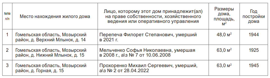Комиссией Мозырского районного исполнительного комитета по обследованию состояния жилых домов, согласно Указу Президента Республики Беларусь от 24 марта 2021 года № 116 «Об отчуждении жилых домов в сельской местности и совершенствовании работы с пустующими домами», проведен осмотр и составлен акт осмотра нижеуказанных жилых домов, имеющих основания для признания их пустующими и включения в реестр пустующих домов.