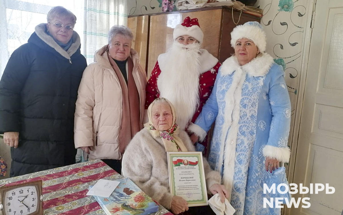 В деревне Моисеевка 95-летнюю Полину Кирилловну Воробьеву навестили исполняющий обязанности председателя Слободского сельисполкома Елена Шульженко вместе с Дедом Морозом и Снегурочкой. В их руках были не только подарки: они вручили Благодарность от Мозырского районного исполнительного комитета, а также высказали искренние слова признательности за ее долгую и насыщенную жизнь, полную мудрости и доброты.