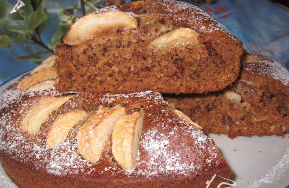 – сверху выложите кусочки яблок, предварительно посыпанных сахаром и корицей. Яблоки при запекании станут светлыми и будут красиво смотреться;