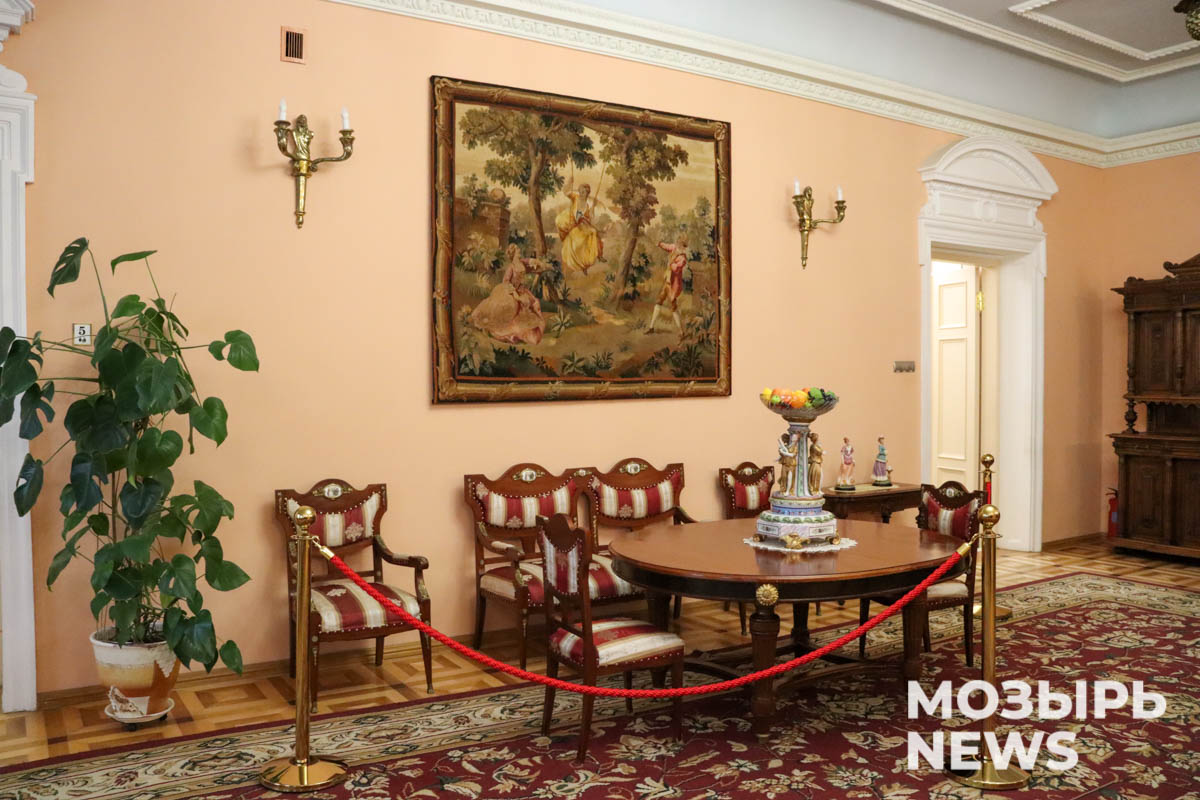 Правда, родных вещей в поместье практически не осталось. Сейчас в залах предметы мебели в основном той эпохи, но не оригинальные, а подаренные коллекционерами, поступившие из таможен или приобретенные в антикварных магазинах. Но все-таки одна родная вещь, которая спустя время вернулась на свое законное место, в этой гостиной есть. Речь идет о зеркале, которое сохранилось в Красном Береге у кого-то из жителей, – после открытия музея его сюда передали в дар.