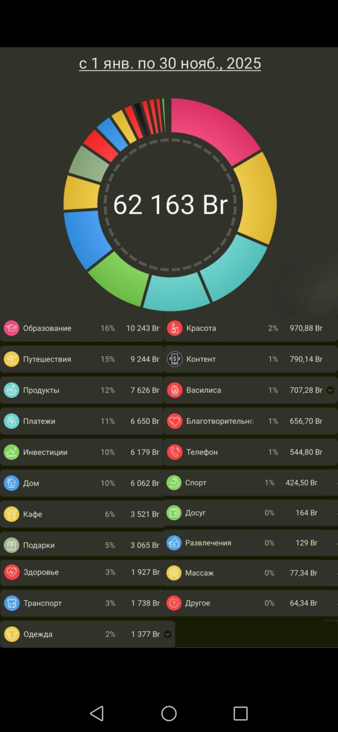 – Я вообще отношусь к учету с азартом, – добавляет Оля. – Важно начать получать от этого удовольствие. Анализ данных за годы открывает много интересного. Например, в прошлом году доходы упали на 11 %, а в этом выросли на 22 %. Два предыдущих года мы в основном сохраняли и приумножали капитал, активно используя разные инструменты. А в этом году расходы выросли вдвое, но все пошло впрок. Мы много путешествовали: Китай, две поездки в Тулу к родителям, а также по Беларуси. В декабре мы купили нашу первую инвестиционную недвижимость. Когда финансы под контролем, даже крупные траты приносят радость, а не вызывают паники.