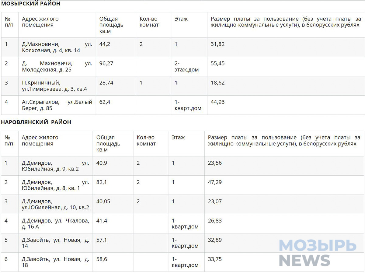 Полный список адресов арендного жилья в Мозыре, а также в Мозырском и Наровлянском районах