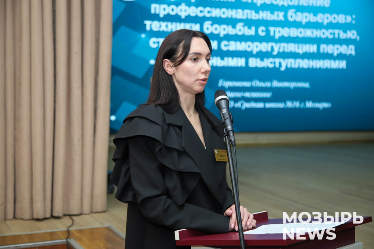Далее о ключевых направлениях трансформации профессиональных компетенций педагога путем психолого-педагогического изучения рассказала педагог-психолог ГУО «Средняя школа № 16 г. Мозыря» Ольга Горенкова. Ольга Владимировна провела с участниками встречи тренинг «Преодоление профессиональных барьеров»: техники борьбы с тревожностью, стратегии саморегуляции перед публичными выступлениями.
